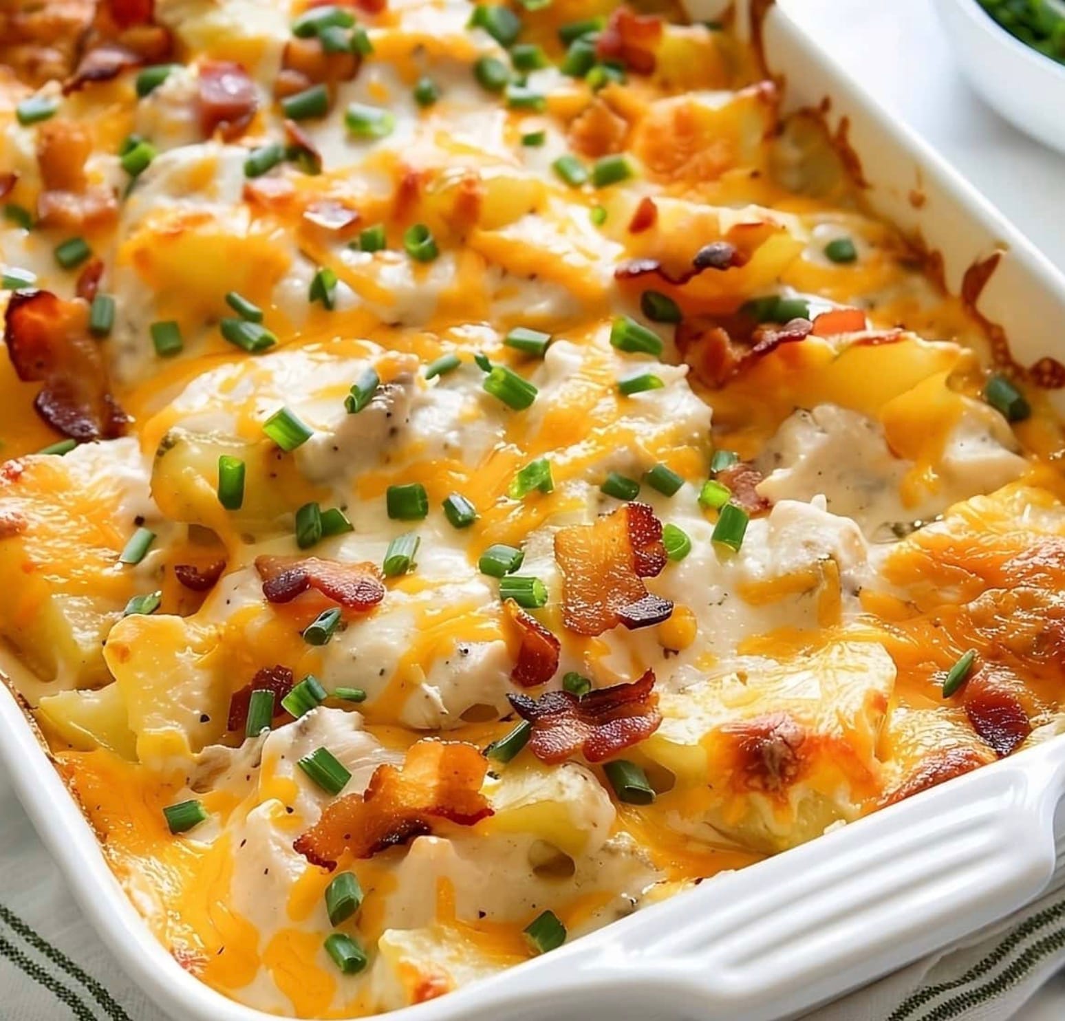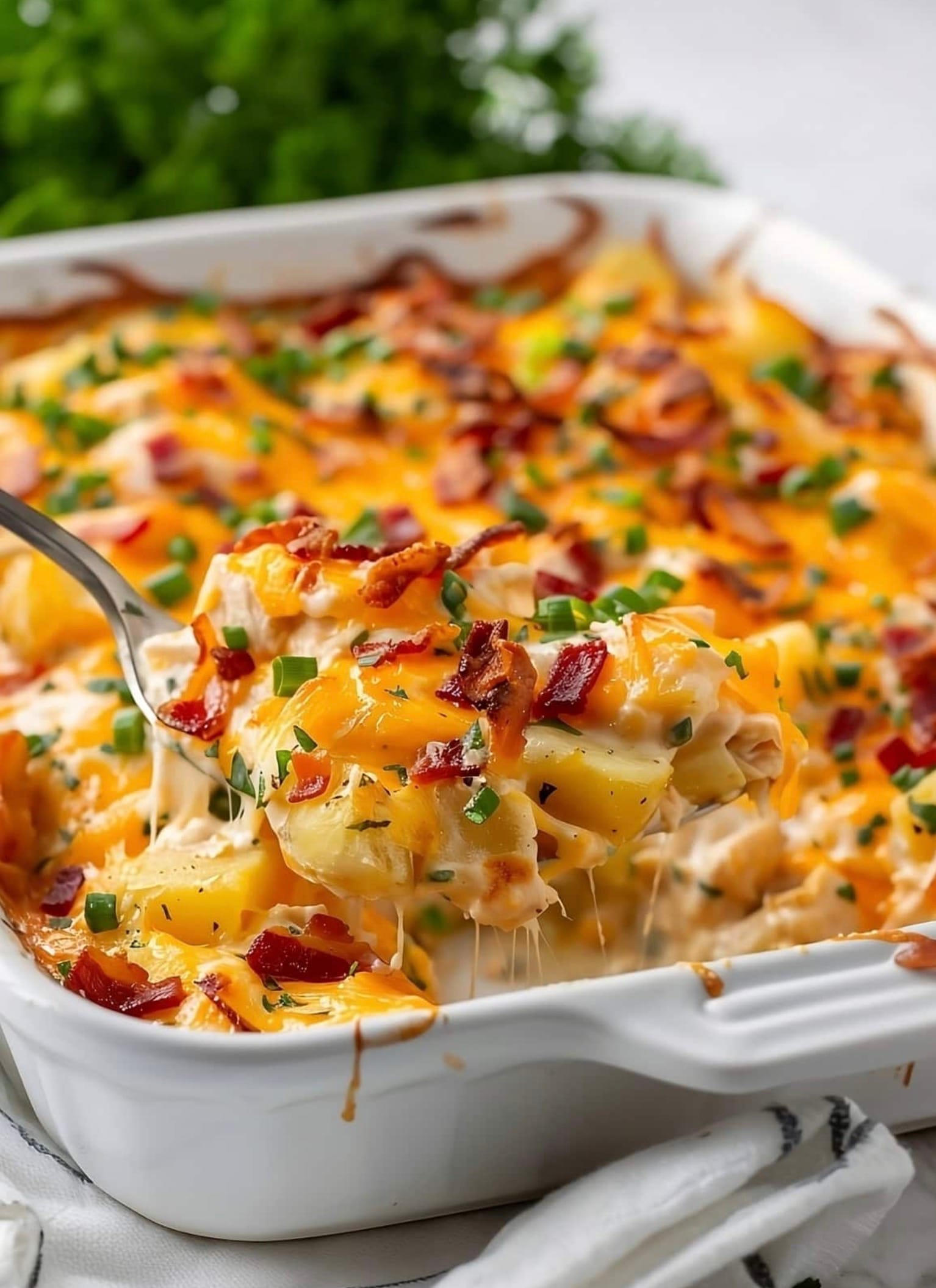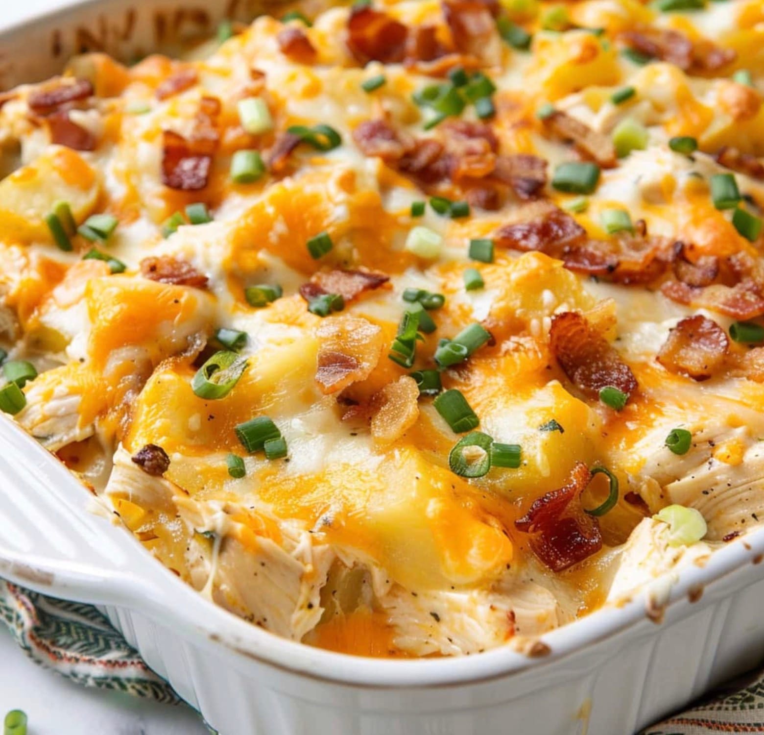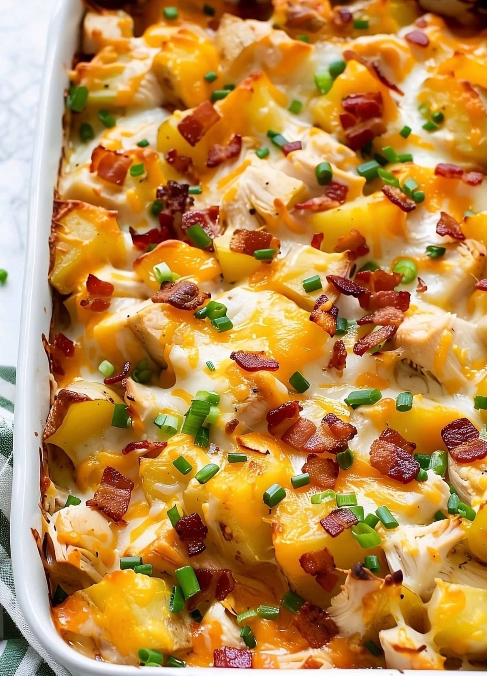 Looking for a tasty dinner idea? Try this chicken and potato casserole! It’s easy to make and feeds six people. You’ll need about an hour to prep and cook this yummy meal. The dish has chicken, potatoes, bacon, and cheese. It’s creamy and full of flavor.