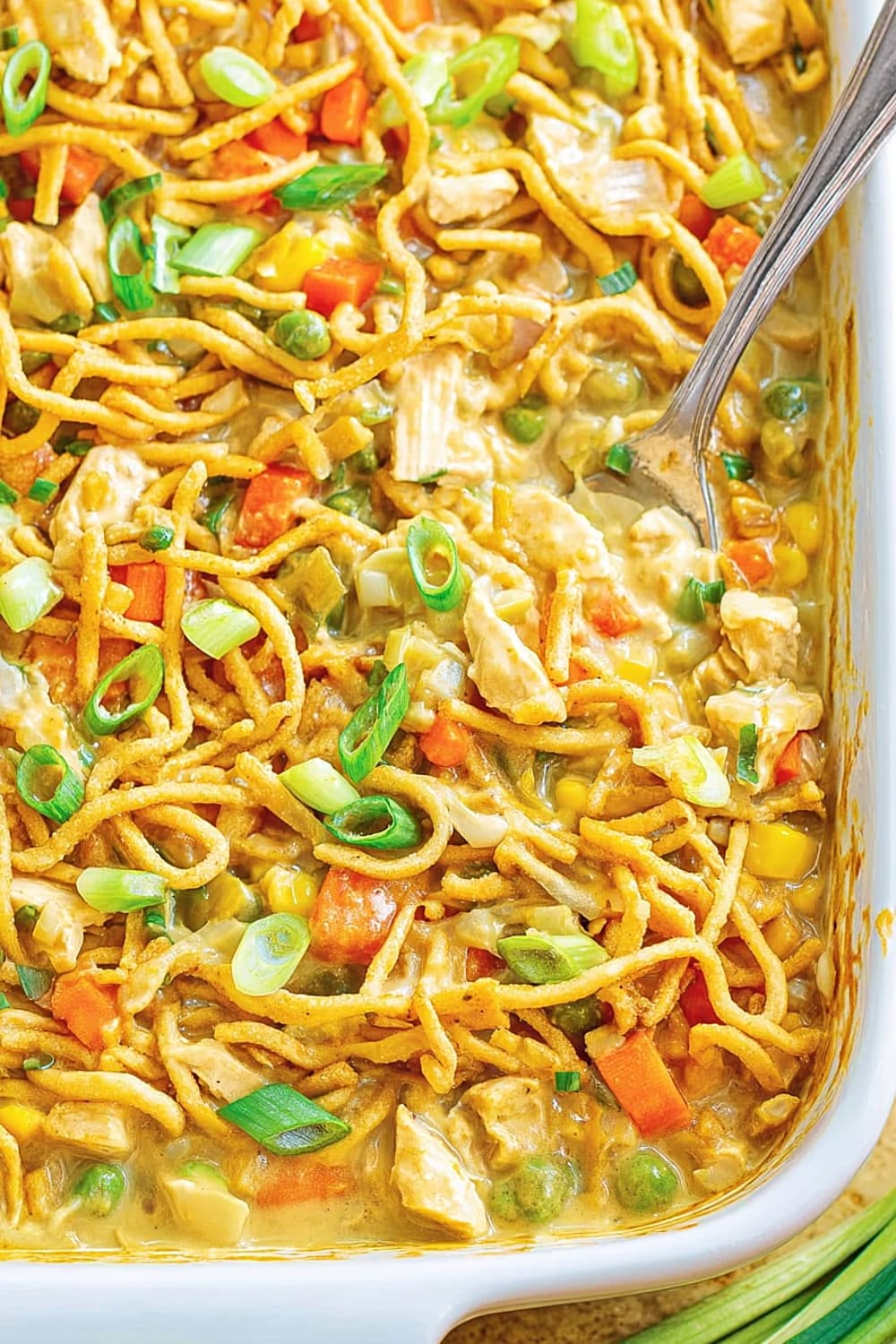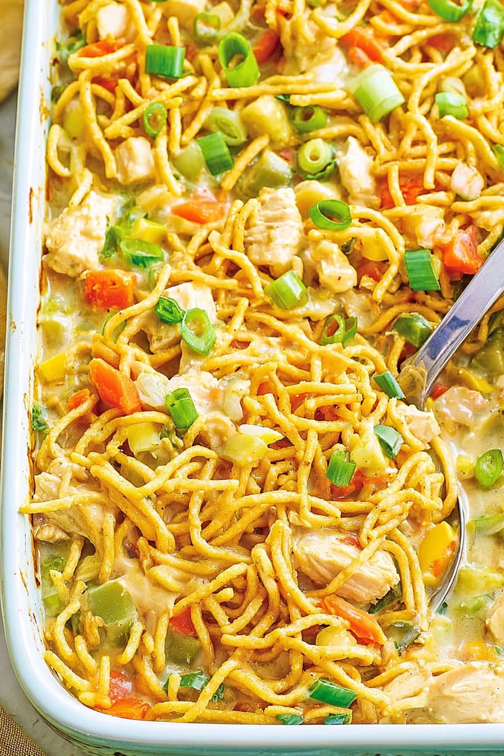 The genius here is how those chow mein noodles work double duty: some get mixed right into the creamy base for texture, while others go on top to create that irresistible crunchy layer that everyone fights over.