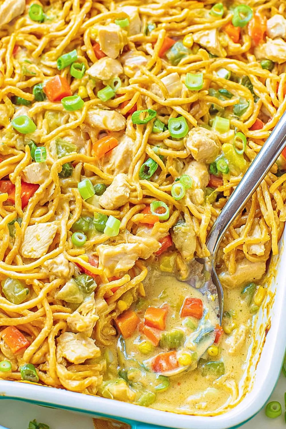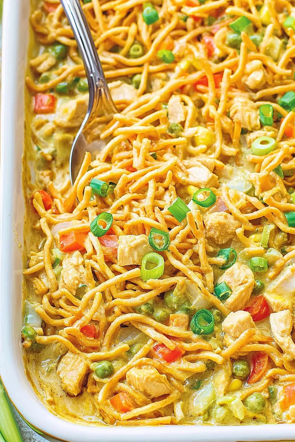 - 7 Transfer the entire mixture to your prepared casserole dish, spreading it evenly with a spatula. Top evenly with the remaining 1 cup chow mein noodles, ensuring good coverage for maximum crunch in every bite.
