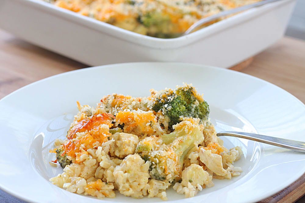 - 8 Pour the chicken and broccoli mixture over the brown rice in the prepared baking dish, making sure to spread it evenly to cover all the rice. Use a spatula to scrape the bowl completely clean of any remaining sauce and add it to the dish – every drop counts for maximum flavor.