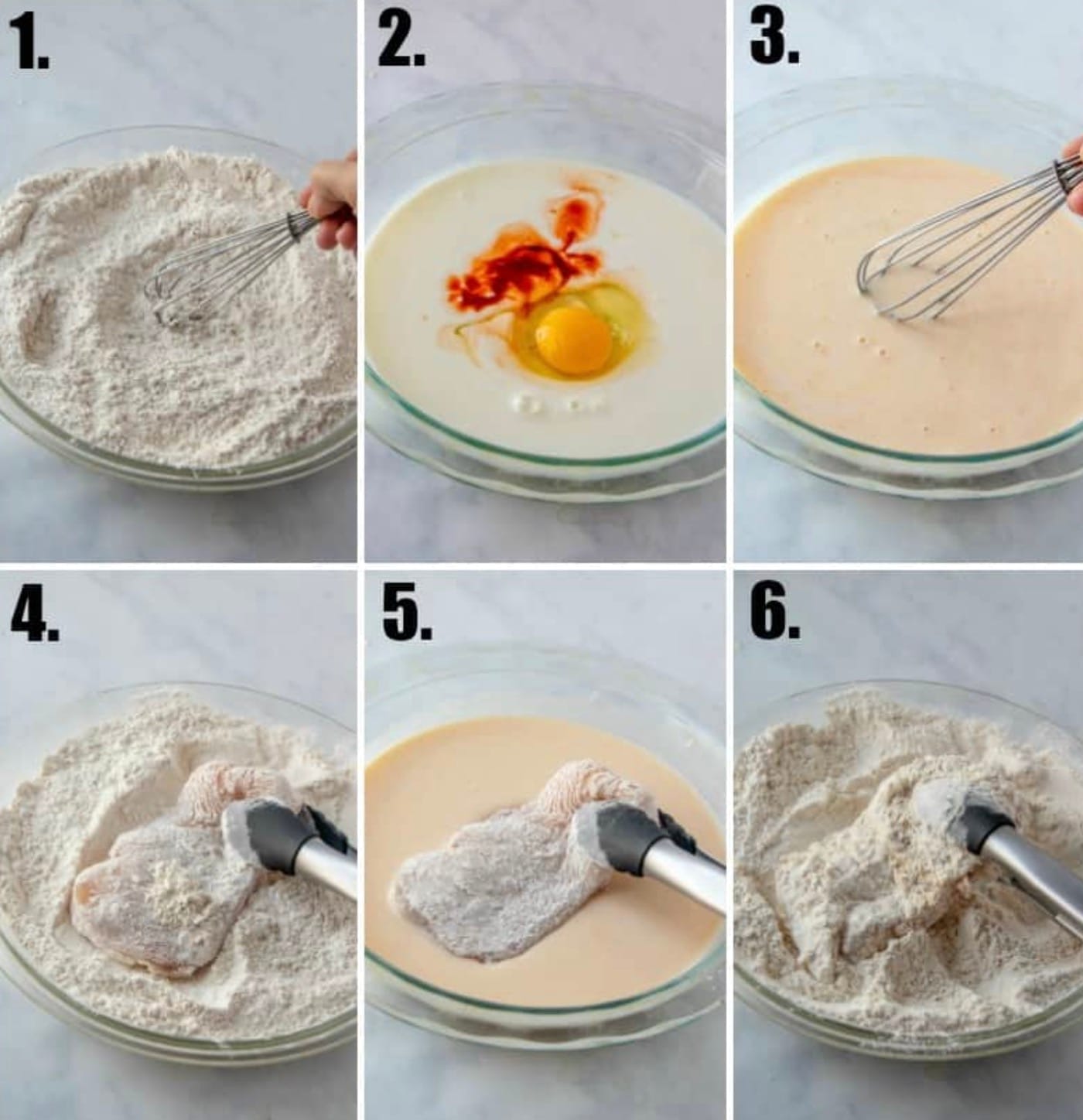 Coat chicken in flour mix, then egg mix, then flour again. Press flour onto chicken for good coverage.