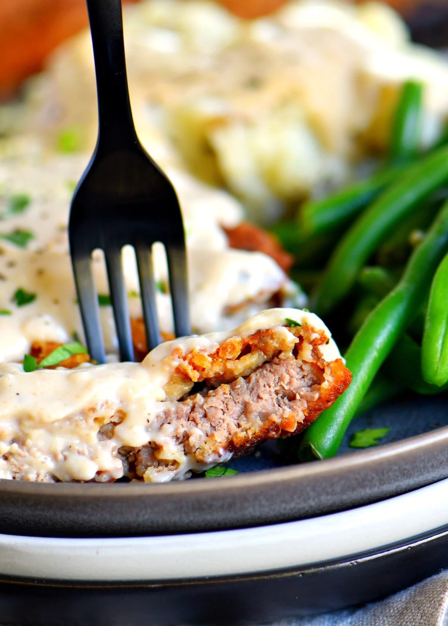 Serve your chicken fried steak with a big scoop of gravy, mashed potatoes, and veggies. Enjoy your homemade comfort food!
