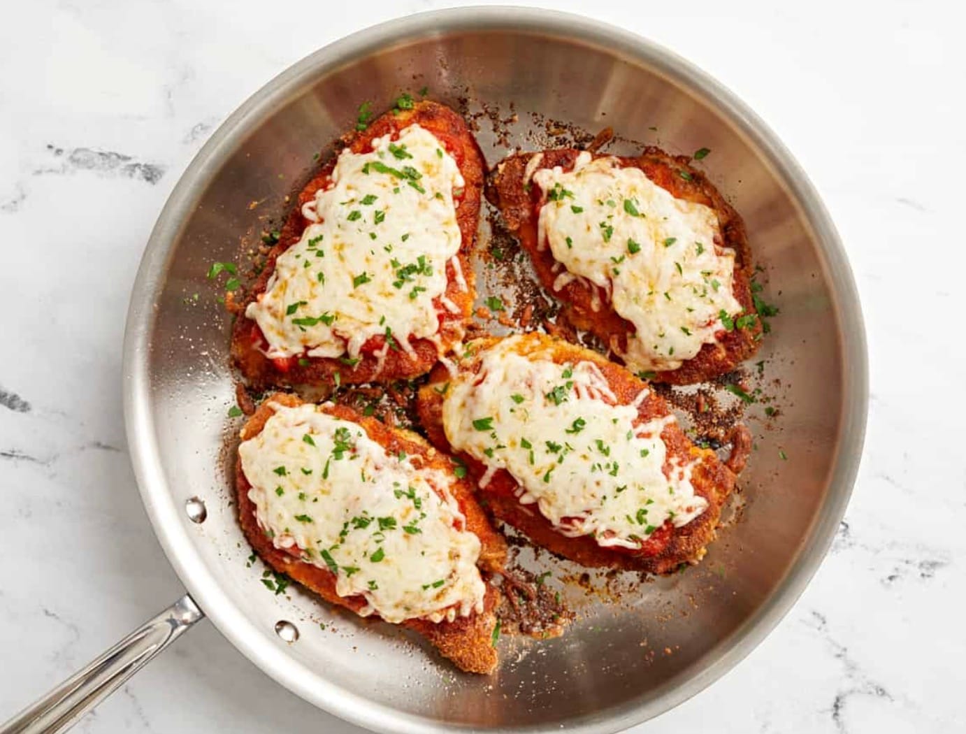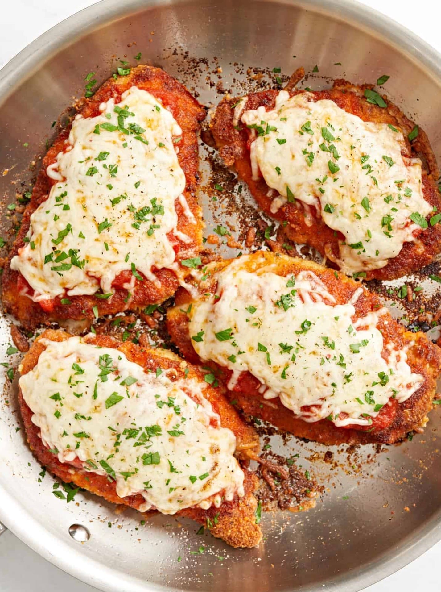 You’ll use the chicken, breadcrumbs, parmesan, and spices to make crispy breaded cutlets. The egg and flour help the coating stick. Cook the chicken in oil until golden. Top with marinara and mozzarella, then melt. Sprinkle with parsley if you like.