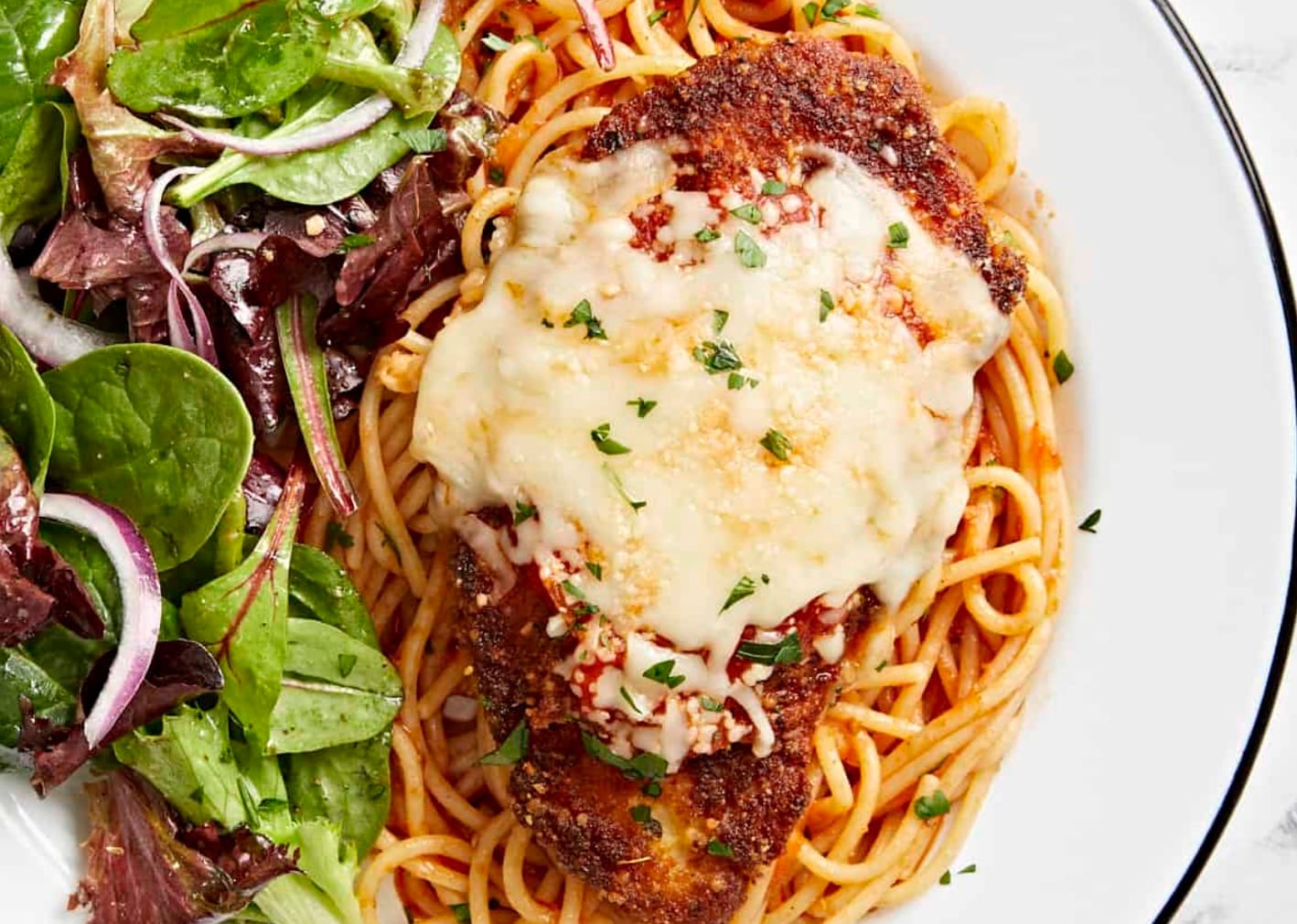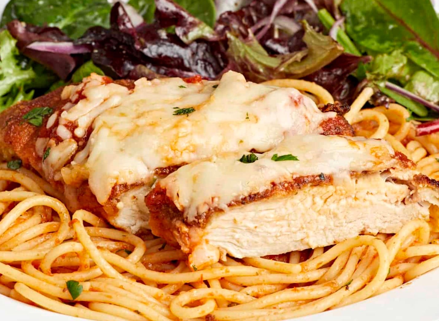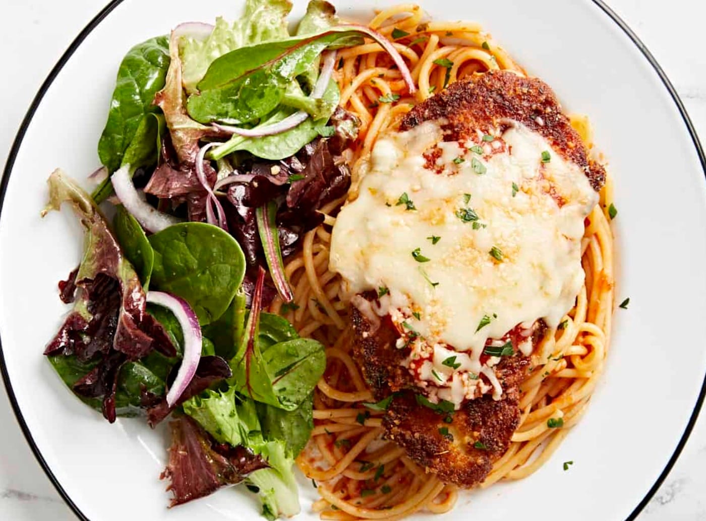 Try serving your chicken parm over zucchini noodles or spaghetti squash for a low-carb option. It’s just as tasty and cuts down on calories.