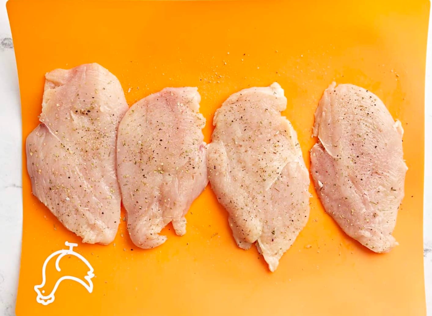 Start by cutting your chicken breasts into thin cutlets. Season both sides with salt, pepper, garlic powder, and Italian seasoning.