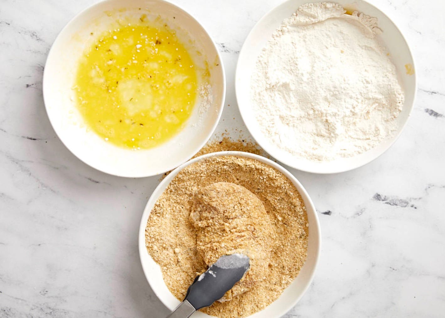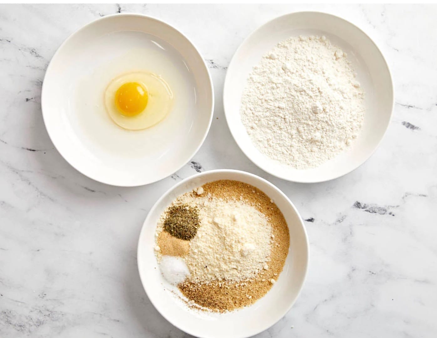 - Mix breadcrumbs, parmesan, and spices in the third bowl