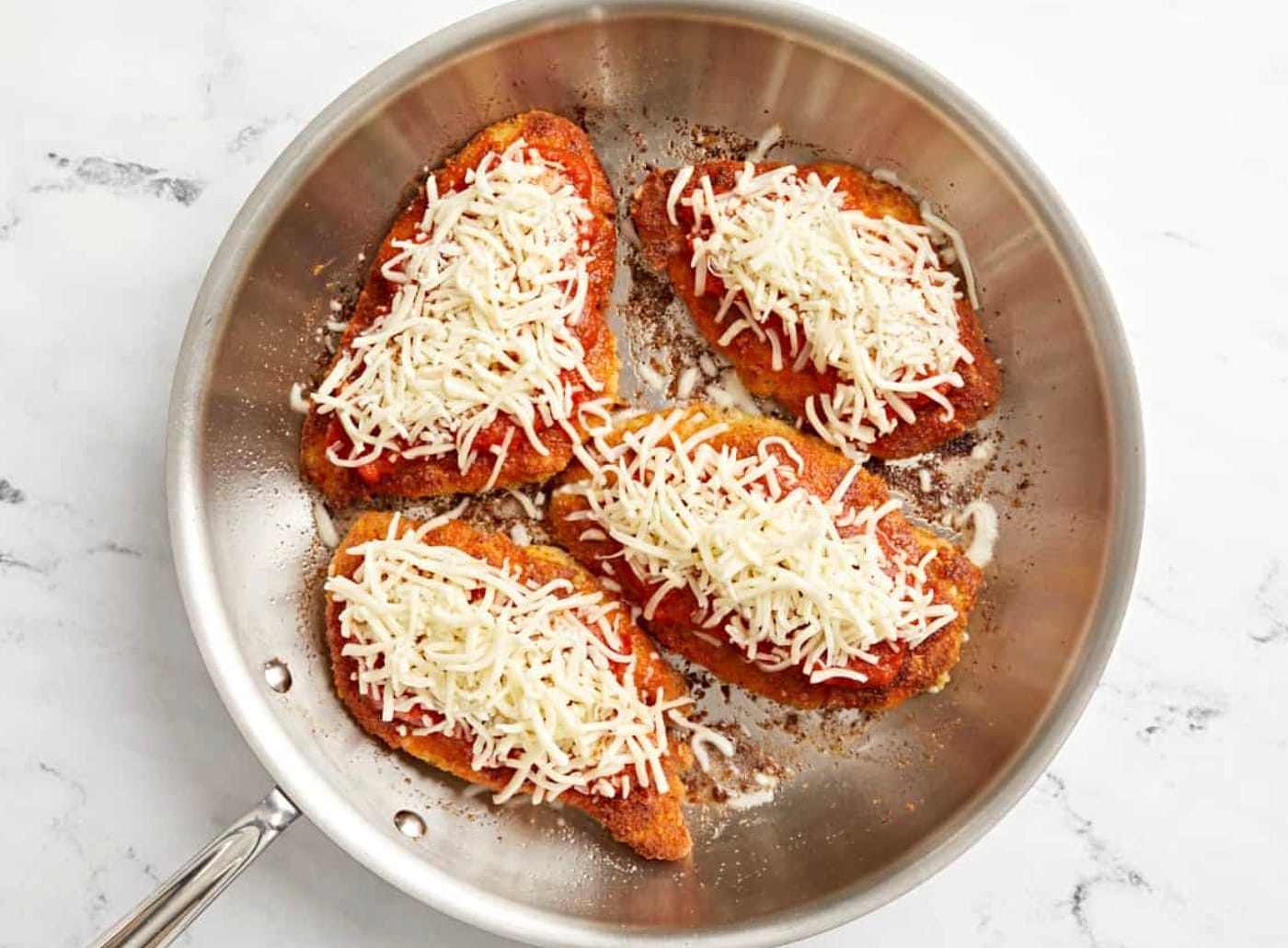 Flip the chicken and turn down the heat. Add marinara sauce and mozzarella on top. Cover the pan and cook for 5-7 more minutes.