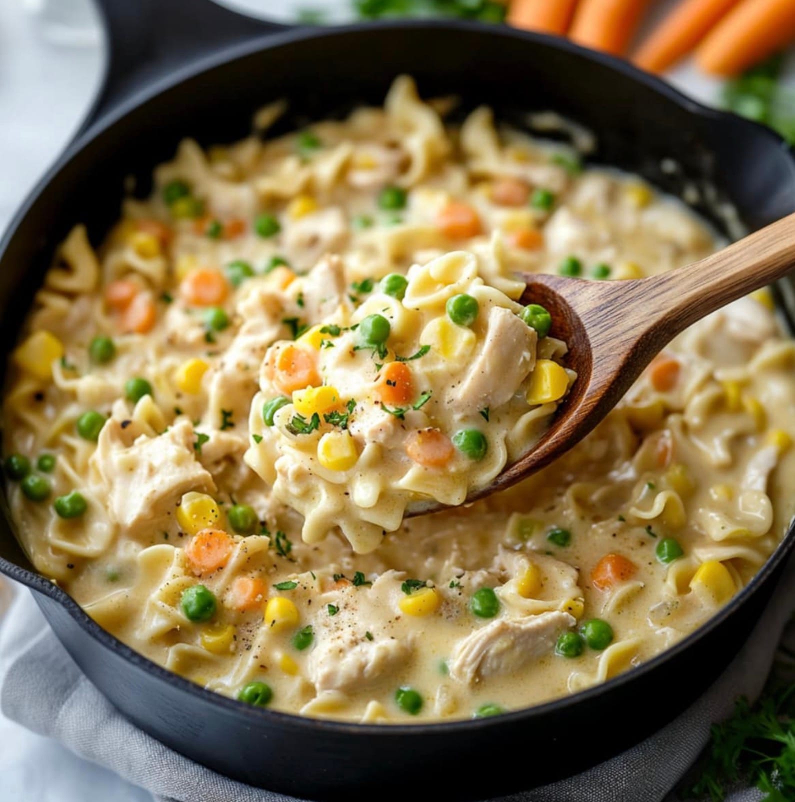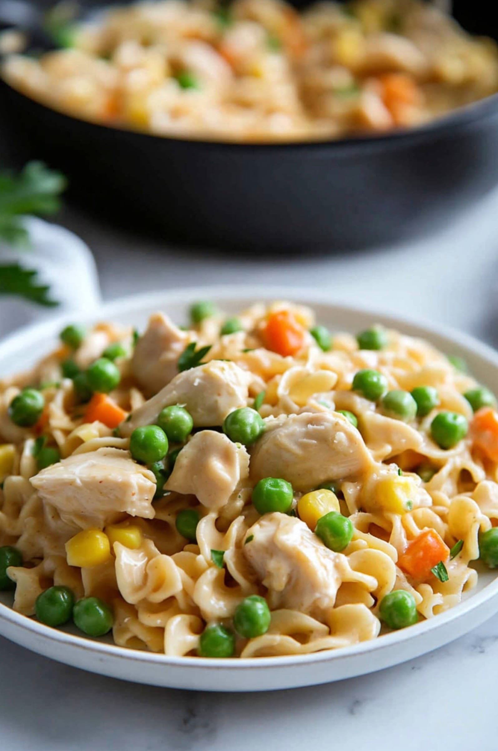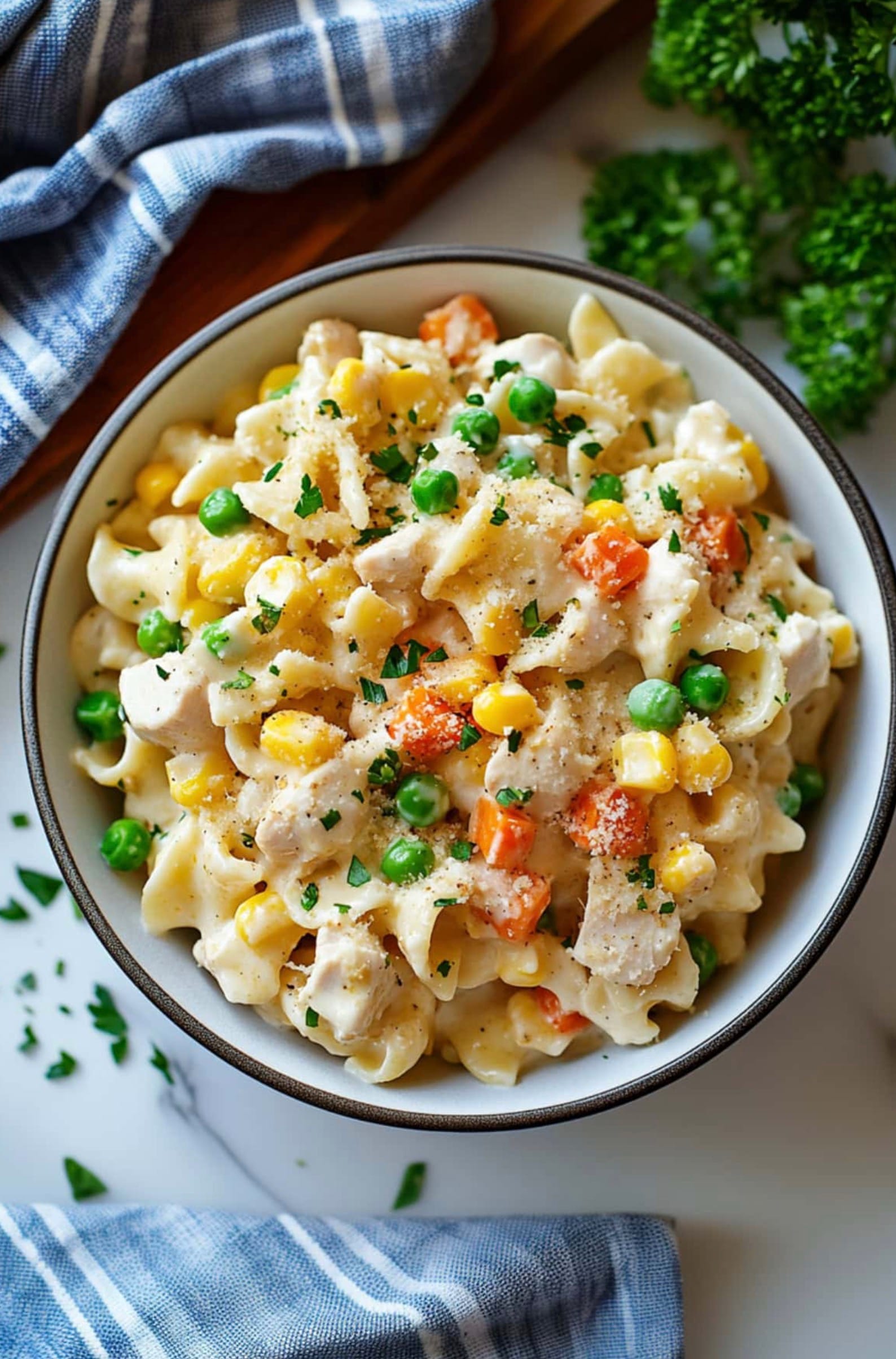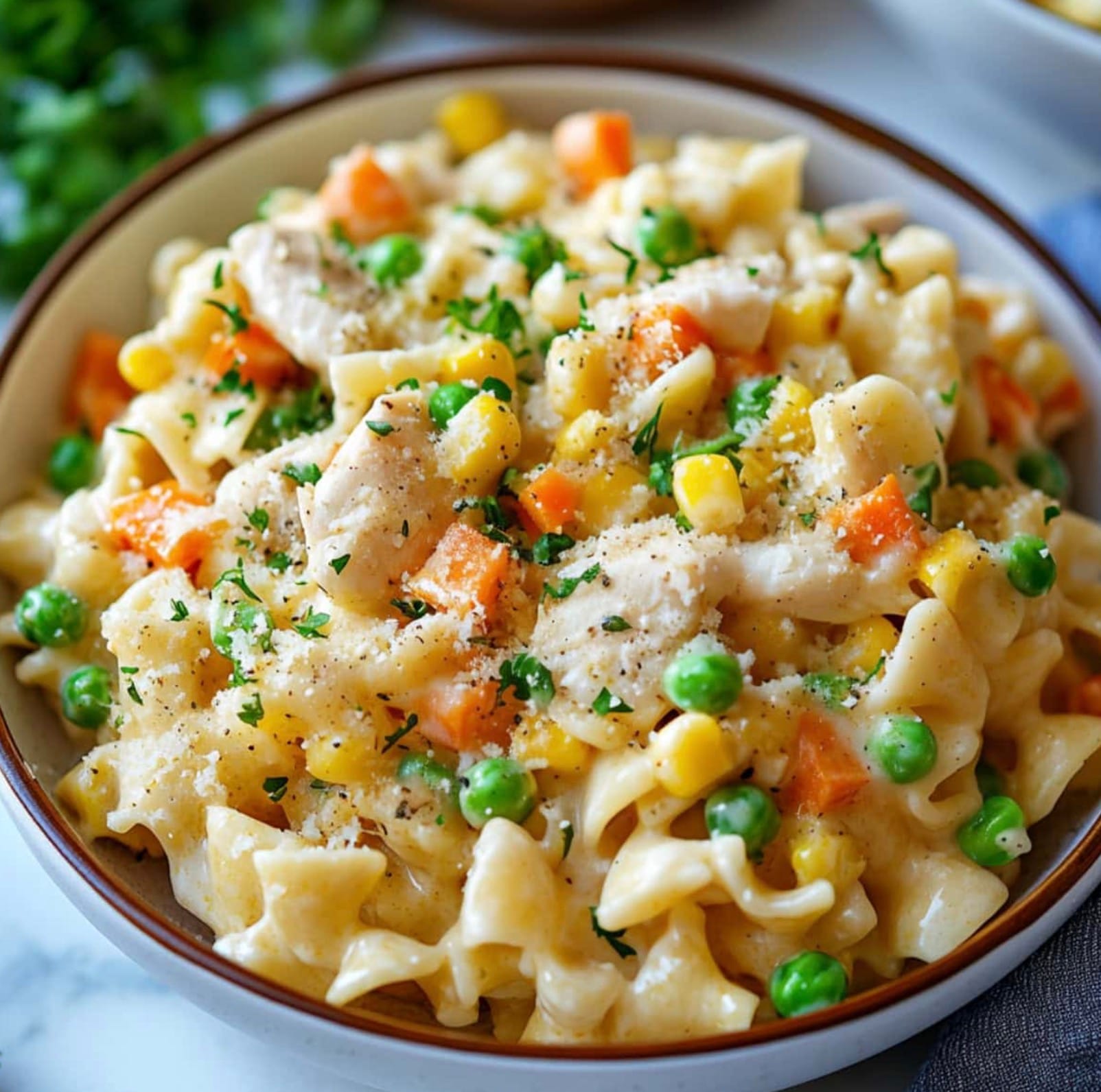 To make this chicken pot pie pasta more diabetes-friendly, you can make a few simple swaps. Try using whole wheat egg noodles instead of regular ones. They have more fiber and won’t spike your blood sugar as much.