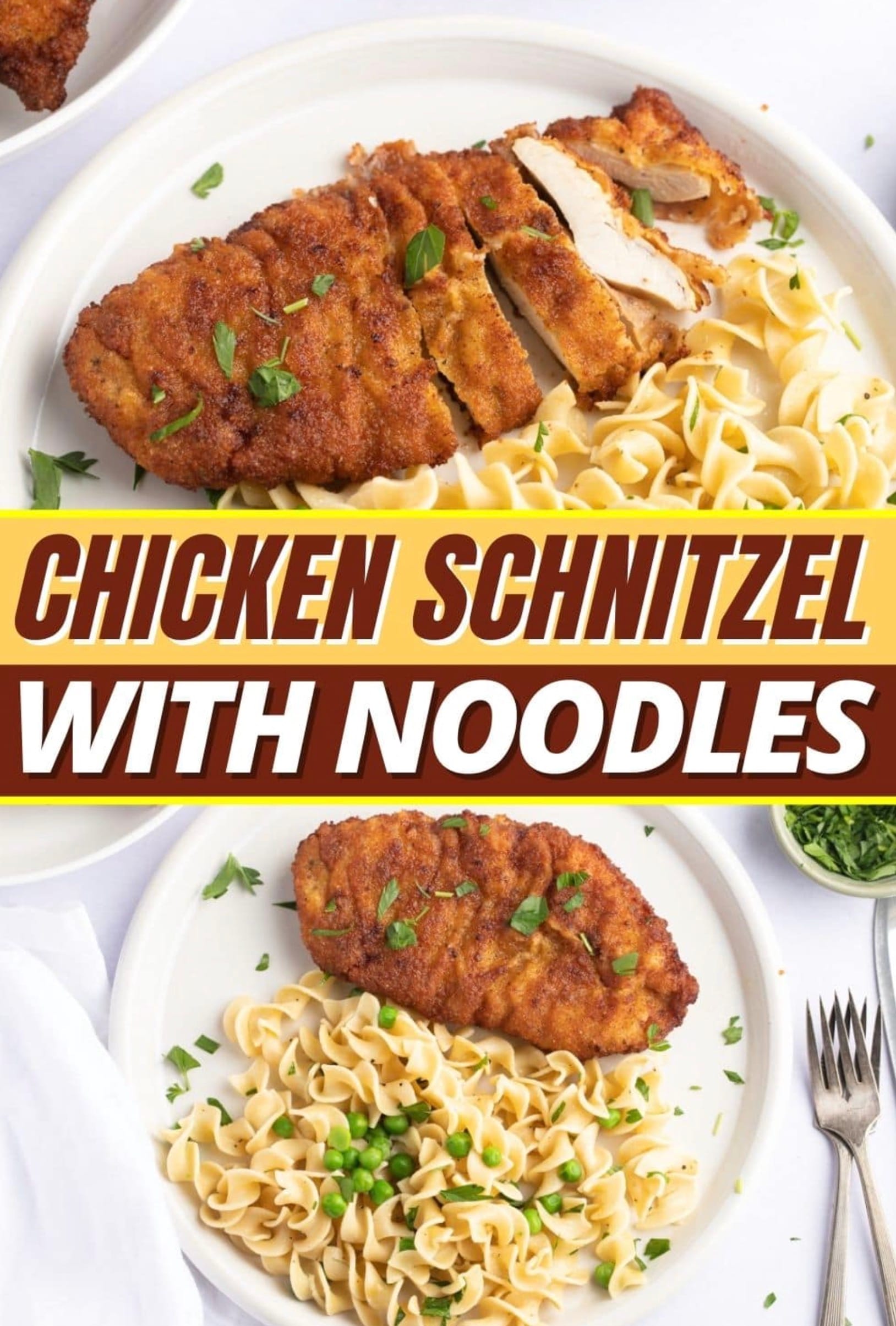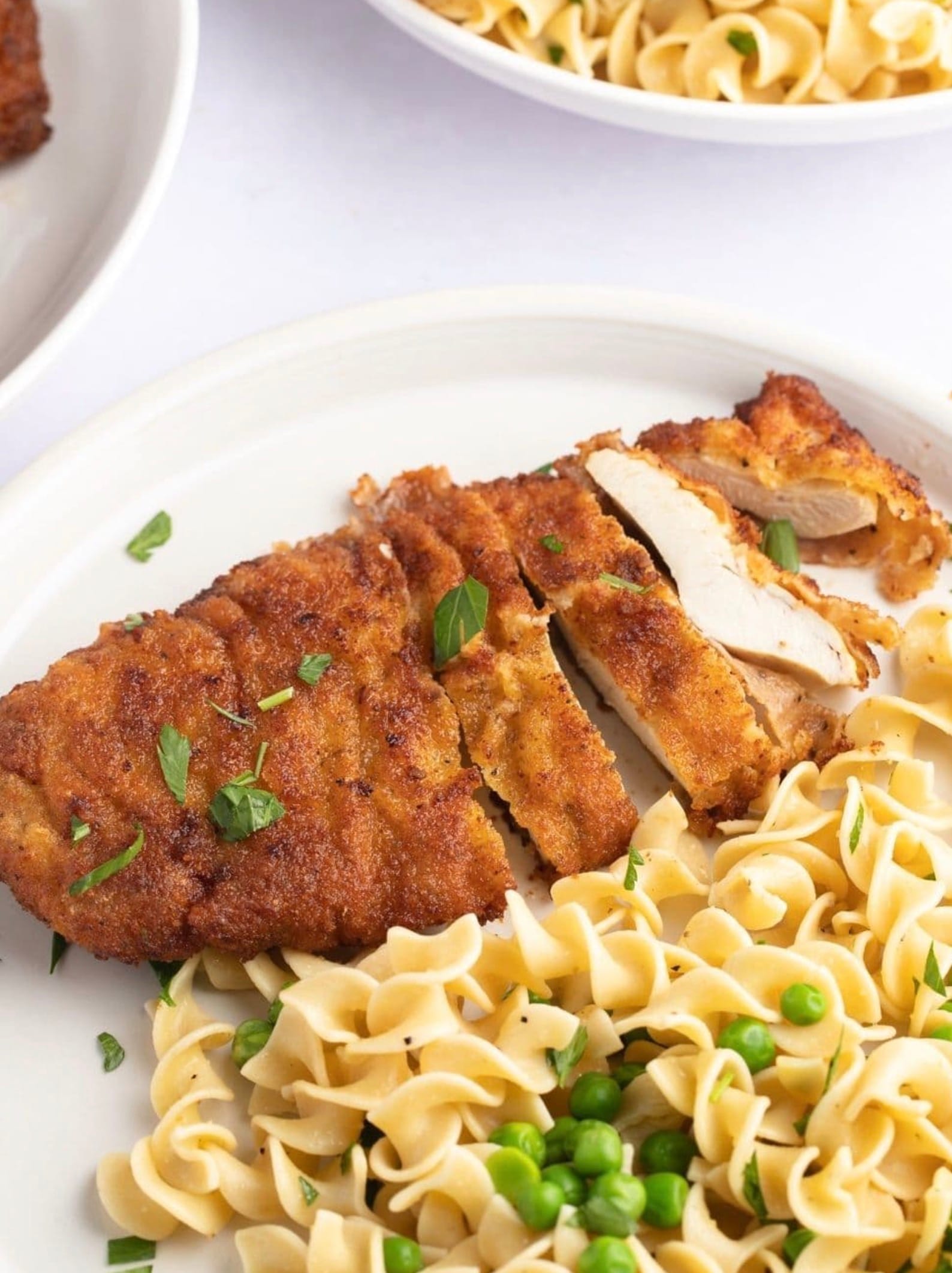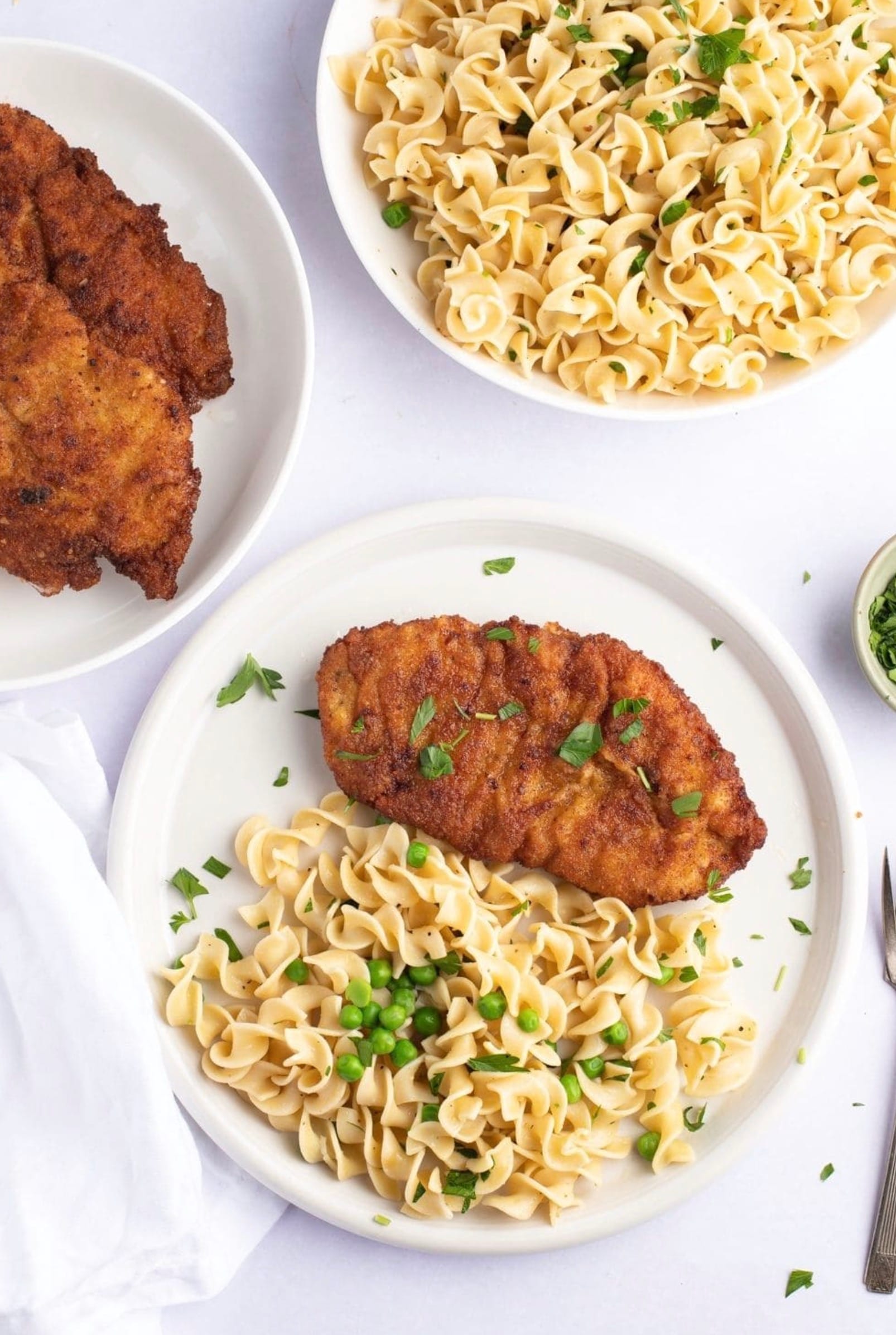Chicken schnitzel with noodles is a tasty meal you can make at home. This Austrian dish pairs crispy breaded chicken with buttery egg noodles and peas. You can whip up this comfort food in under an hour for a filling dinner the whole family will love.