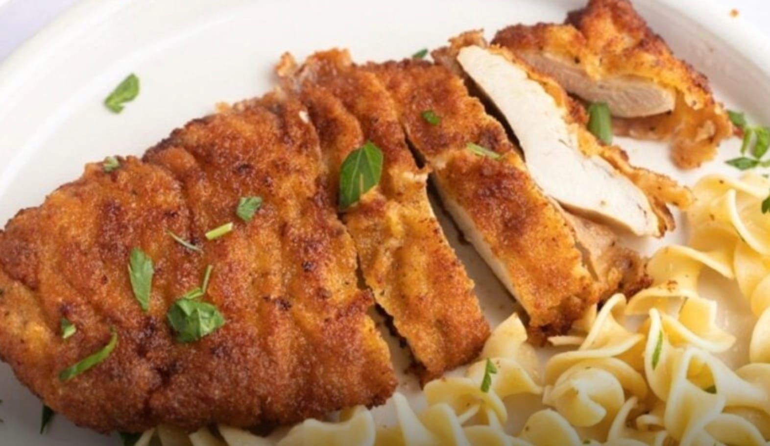 The recipe uses simple ingredients like chicken breasts, breadcrumbs, and egg noodles. The chicken is pounded thin, coated in seasoned breadcrumbs, and fried until golden. Serve it over noodles tossed with butter and herbs for a complete meal. Give this chicken schnitzel with noodles a try for an easy weeknight dinner!
