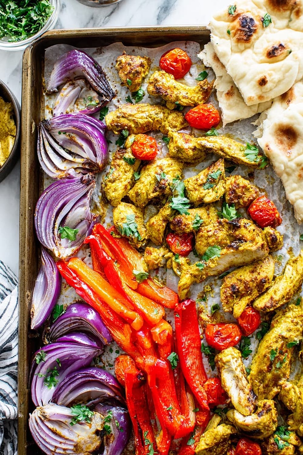 - 5 Arrange the coated chicken, red onion slices, bell pepper strips, and peppadew peppers on the prepared sheet pan in a single layer. Don’t overcrowd—overlapping pieces will steam rather than roast.