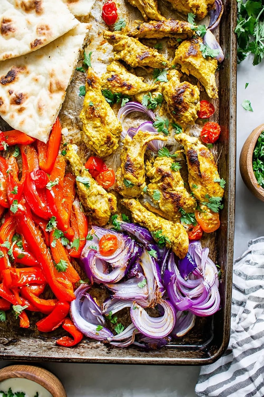 This sheet pan dinner delivers approximately 613 calories per serving with an excellent balance of lean protein, healthy fats, and complex carbohydrates. Each serving provides roughly 45 grams of high-quality protein from the chicken and Greek yogurt, supporting muscle maintenance and satiety. The tahini contributes healthy monounsaturated fats and plant-based protein, while the colorful vegetables add fiber, vitamins, and antioxidants with minimal calories.