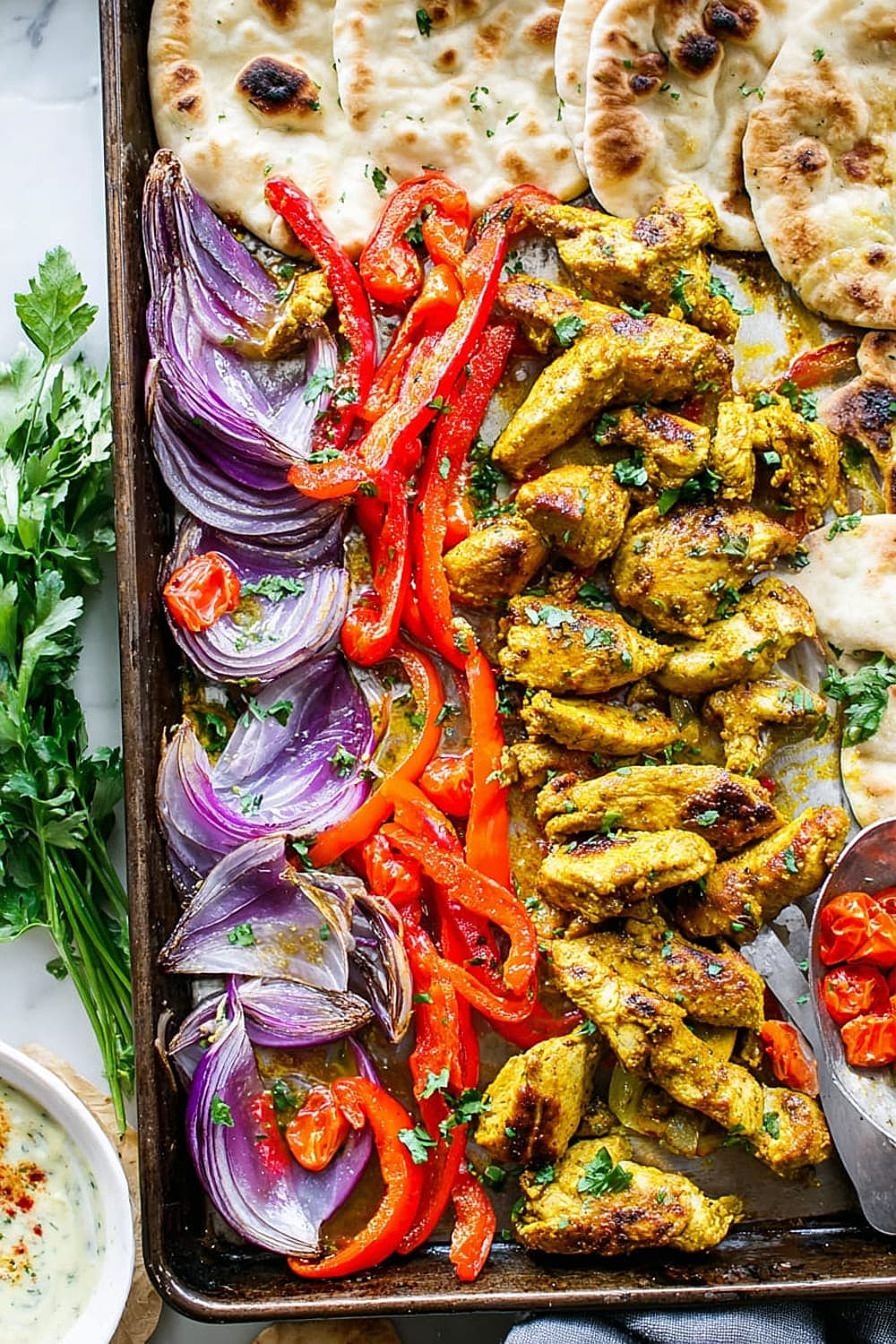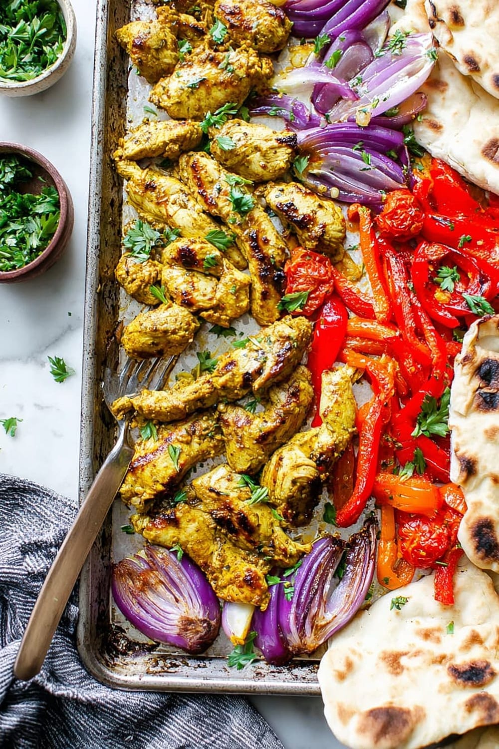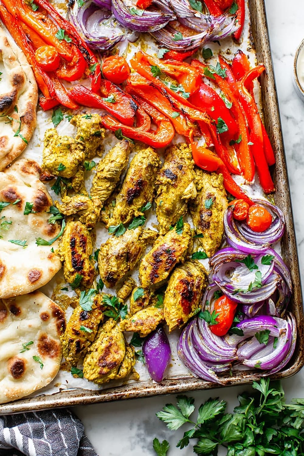 - 8 Serve the chicken and vegetable mixture over warmed pita breads, topped with diced cucumber, sliced tomatoes, a generous drizzle of tahini sauce, and fresh parsley. The contrast of warm spiced chicken with cool, crisp vegetables creates the perfect bite.