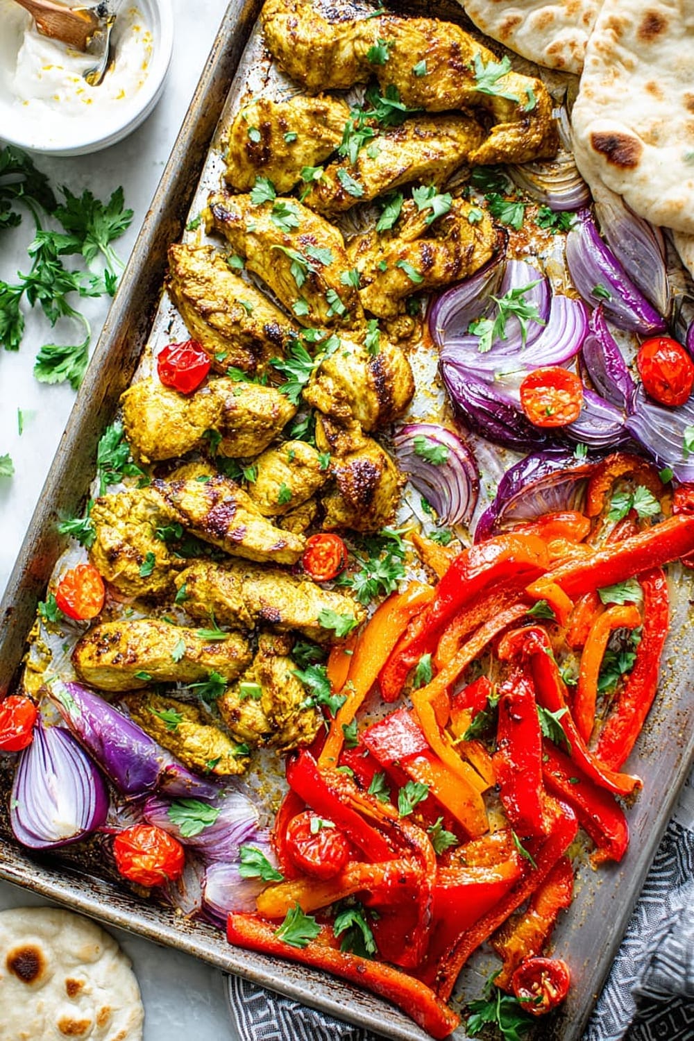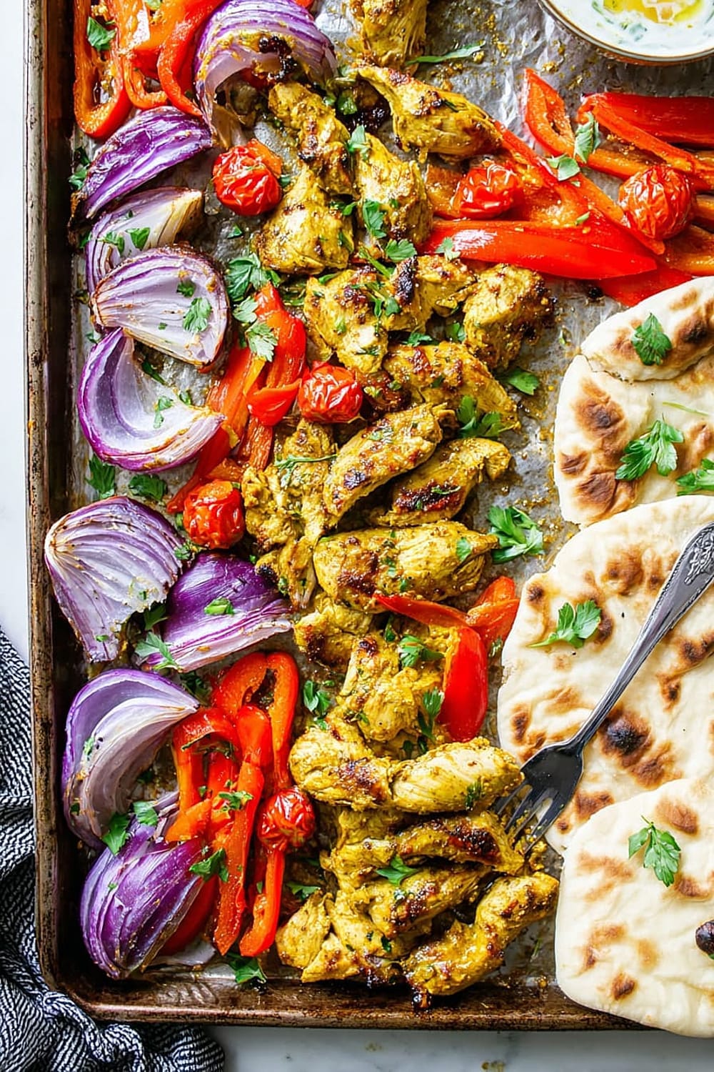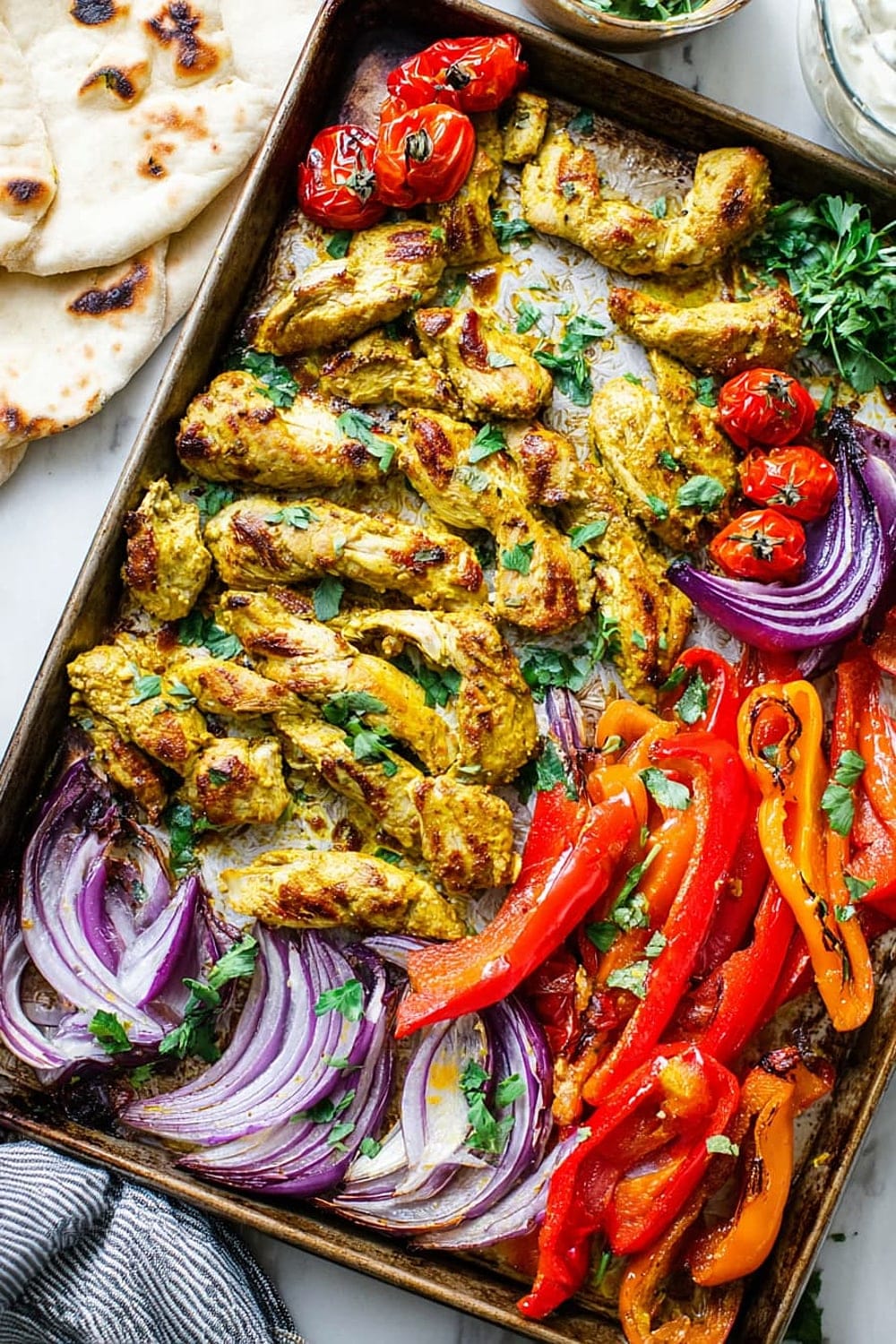 - 8 Serve the chicken and vegetable mixture over warmed pita breads, topped with diced cucumber, sliced tomatoes, a generous drizzle of tahini sauce, and fresh parsley. The contrast of warm spiced chicken with cool, crisp vegetables creates the perfect bite.