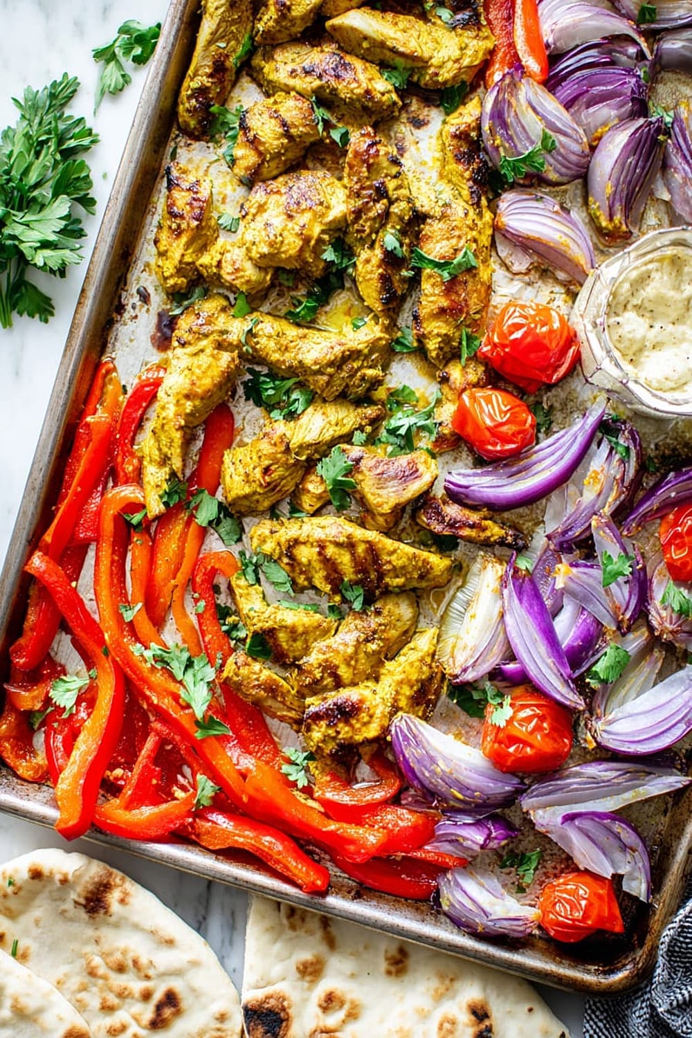 Marinate chicken up to 24 hours ahead for even deeper flavor development. Prep vegetables the night before and store covered in refrigerator. Make tahini sauce up to one week ahead—it actually improves in flavor. Assemble everything on the sheet pan in the morning, cover, and refrigerate until ready to bake.