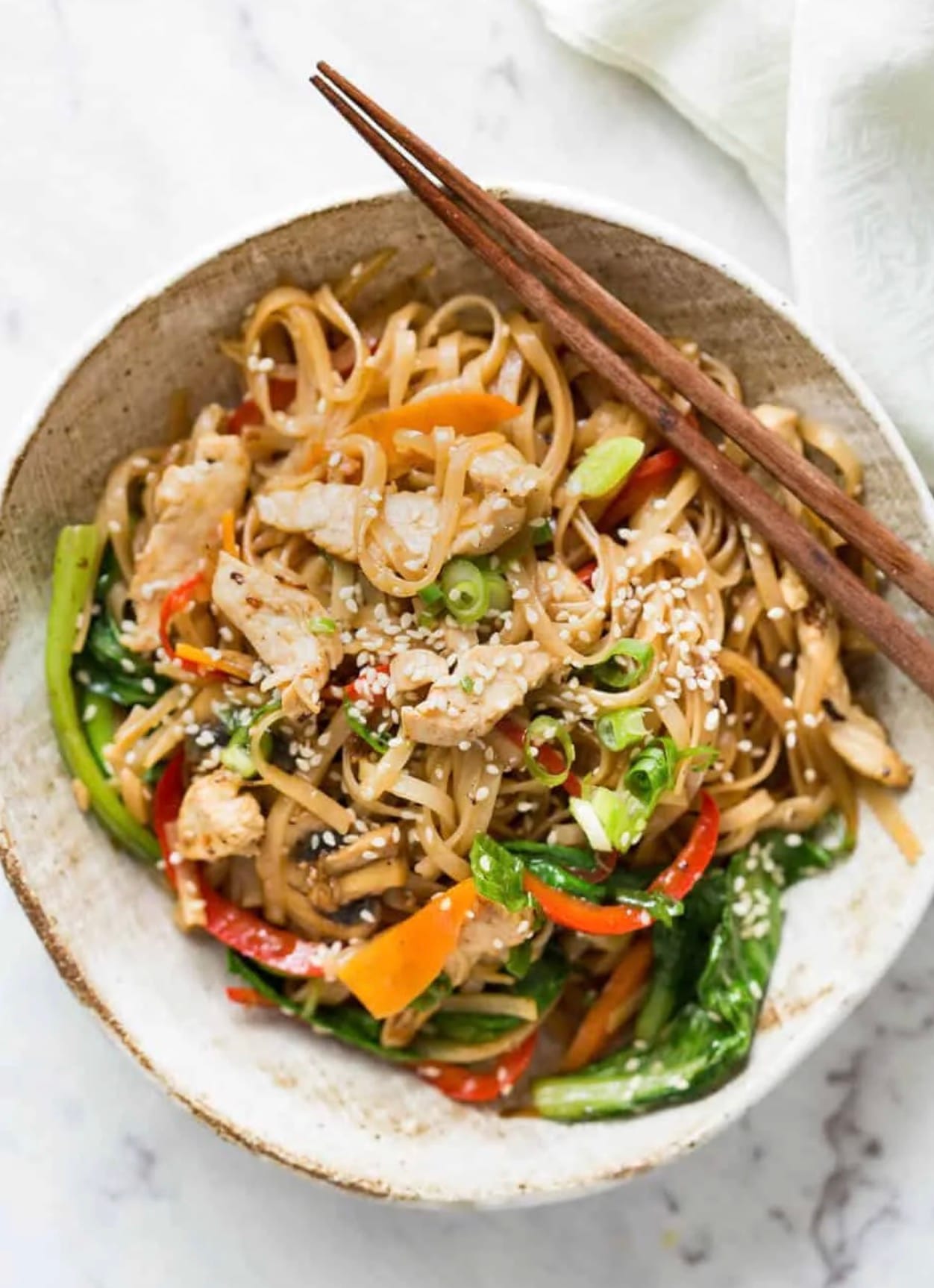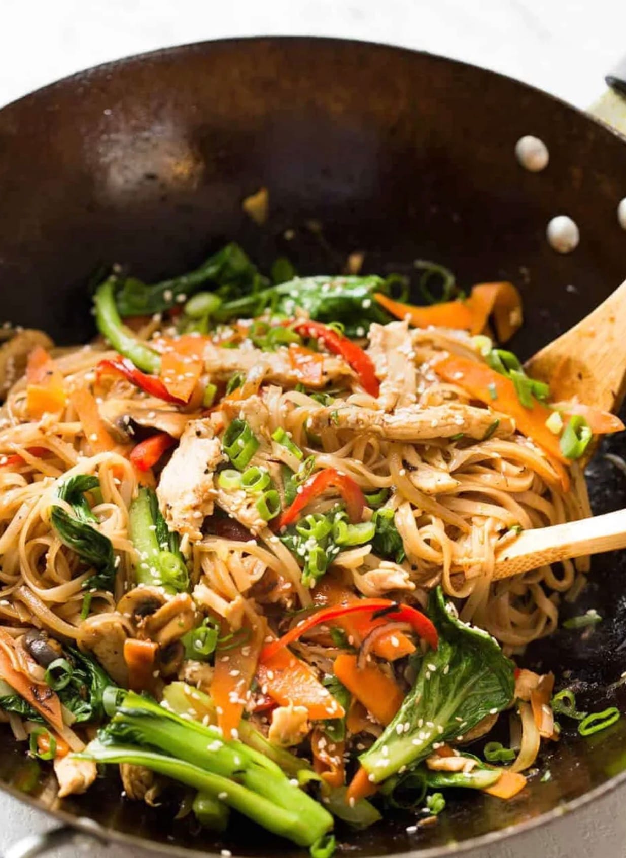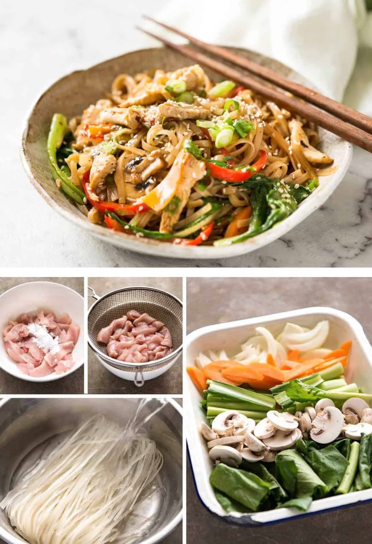 You only need a few basic ingredients like chicken, veggies, and rice noodles. The simple sauce adds great flavor without being too heavy.