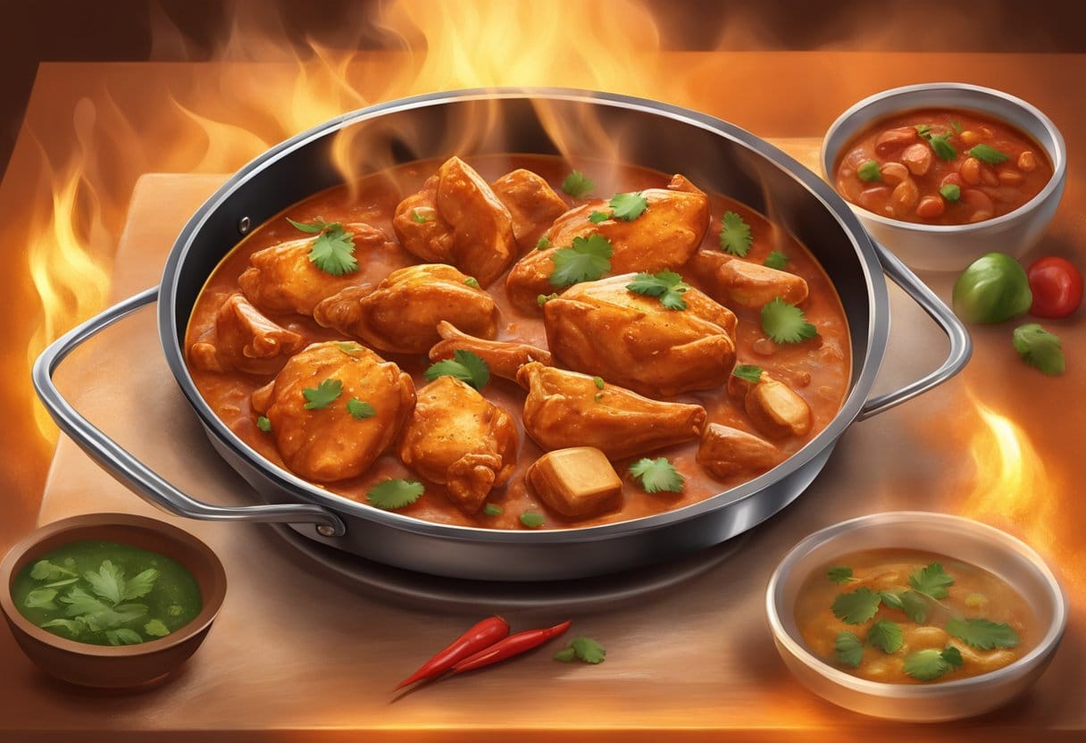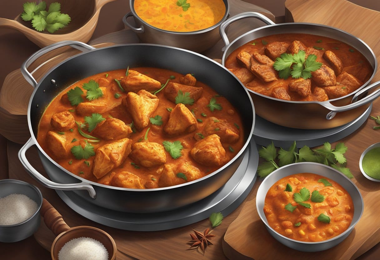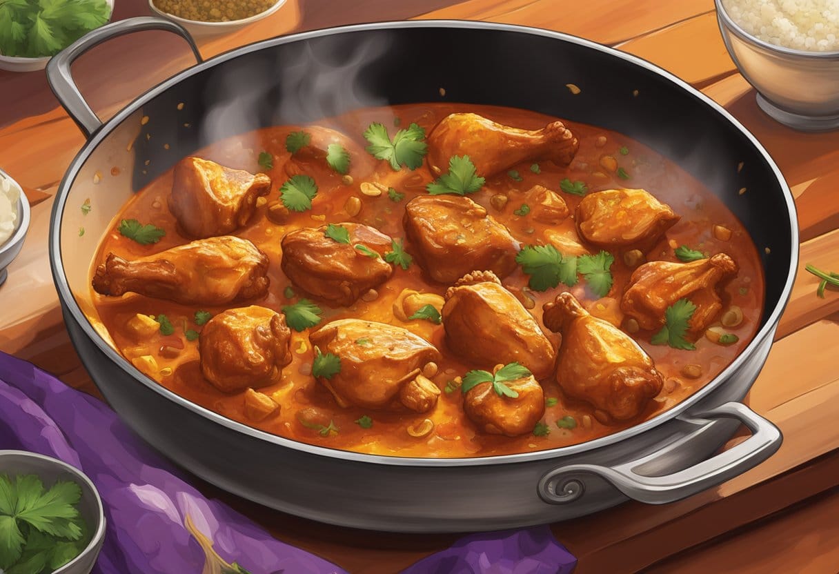 When I cook Chicken Vindaloo, I start by marinating the chicken in a blend of vinegar, garlic, and a variety of spices, including Kashmiri red chili peppers for heat. This Portuguese-influenced Indian dish is notable for its fiery, tangy sauce that stems from a vindaloo spice paste. The marinated chicken is then cooked in this paste along with onions and sometimes potatoes, infusing the meat with the bold, spicy flavors for which the Vindaloo is renowned. For those looking to make an authentic version at home, following a Chicken Vindaloo Recipe can guide through the process.