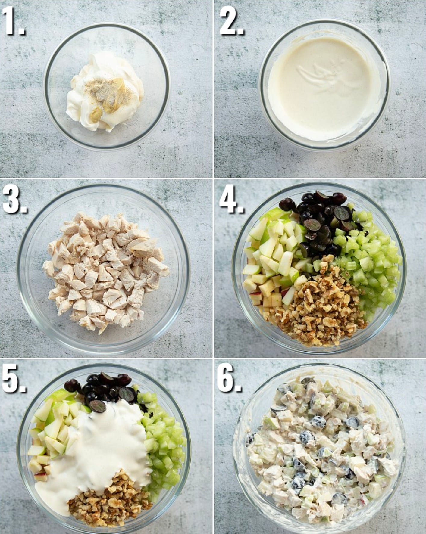 Now, let’s make the salad. Grab a large bowl and add the diced chicken. Mix in the grapes, apple, celery, and walnuts. Pour in the dressing and stir well.