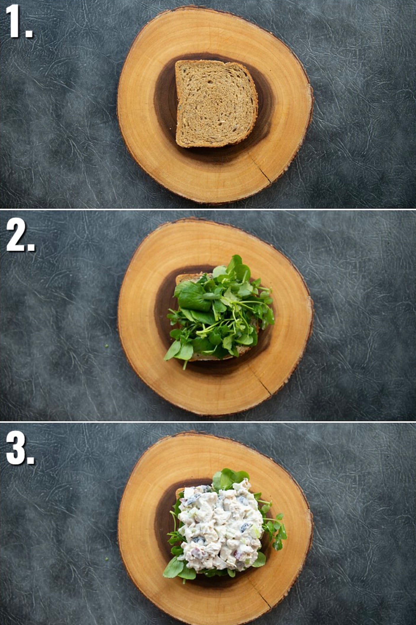 Time to build your sandwiches! Butter one side of each bread slice. On half the slices, add a pinch of watercress. Spoon the Waldorf salad on top.