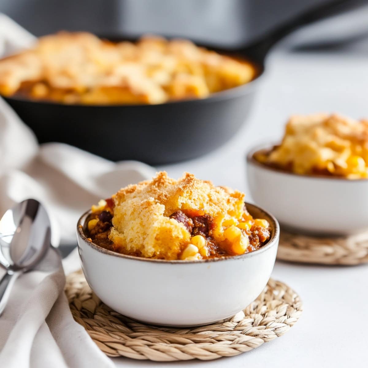 To make ahead, prepare the chili base and store it separately from the cornbread batter. When ready to eat, reheat the chili, top with fresh batter, and bake.