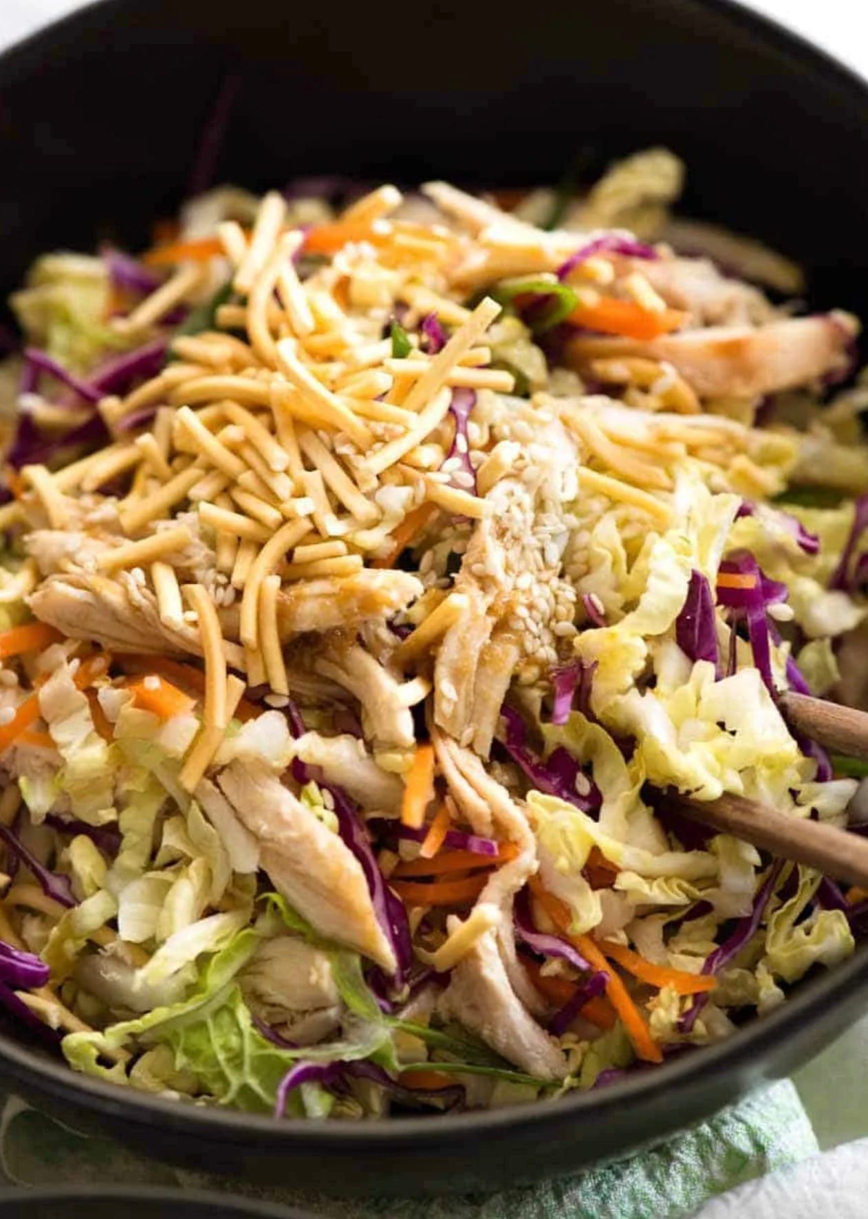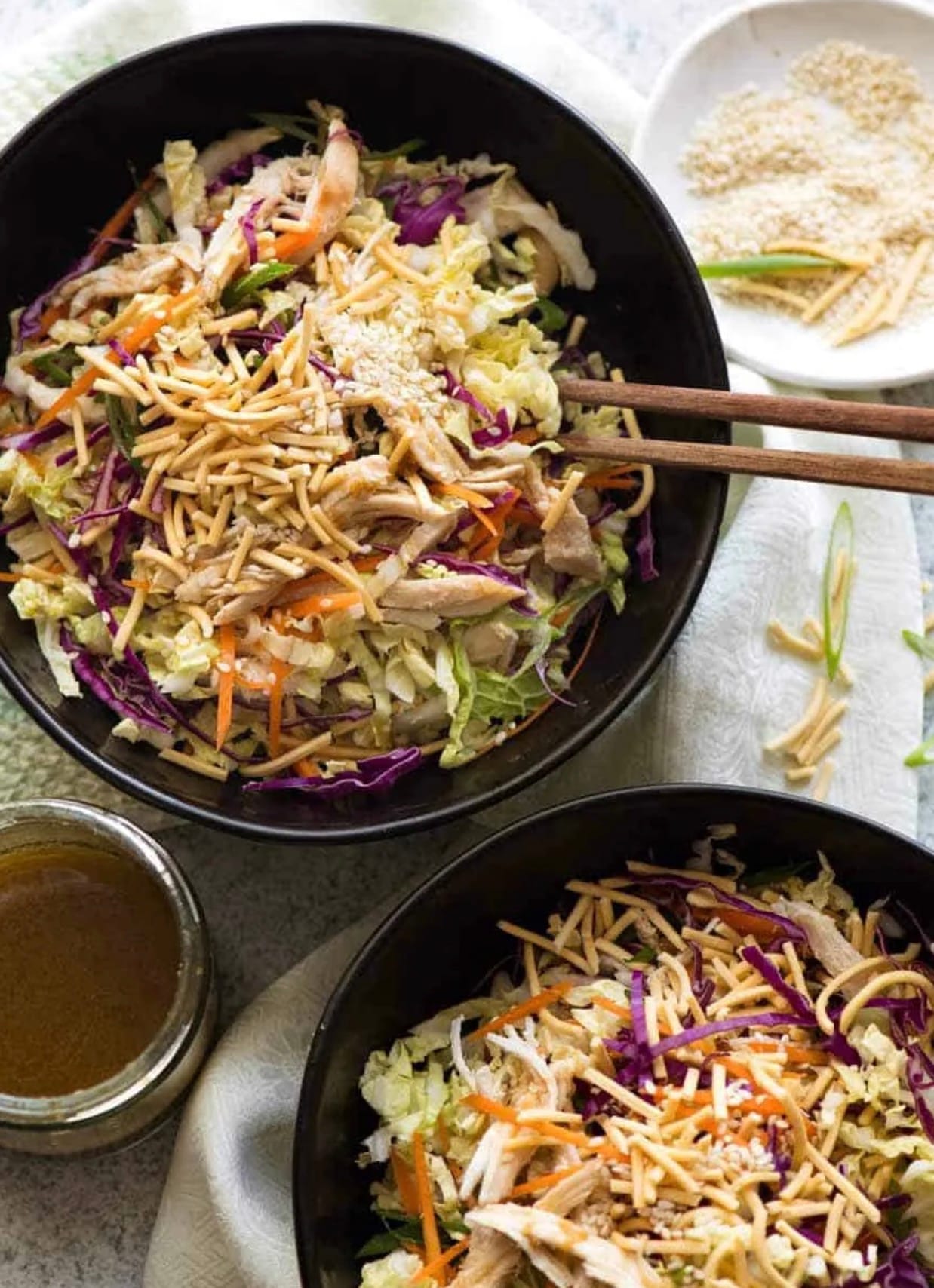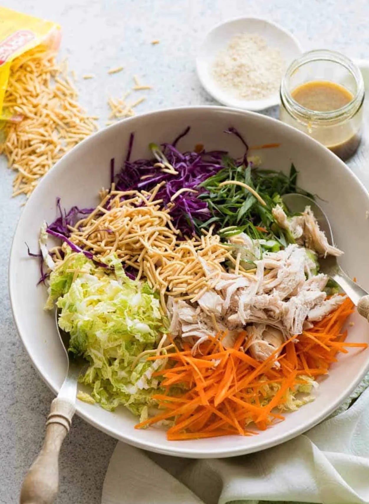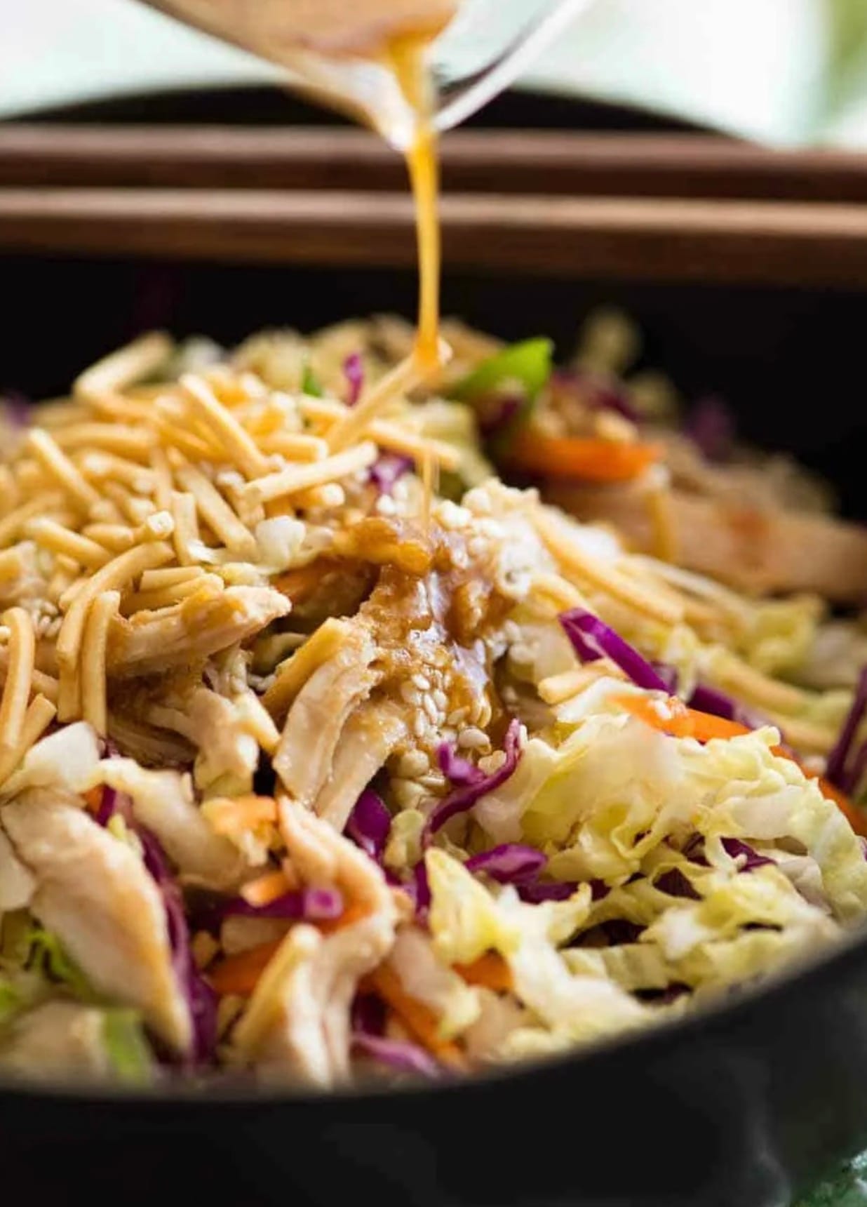 The salad has shredded cabbage, carrots, and chicken. It’s topped with crunchy noodles and sesame seeds. The dressing is a blend of soy sauce, rice vinegar, and sesame oil. It’s sweet, tangy, and full of flavor.