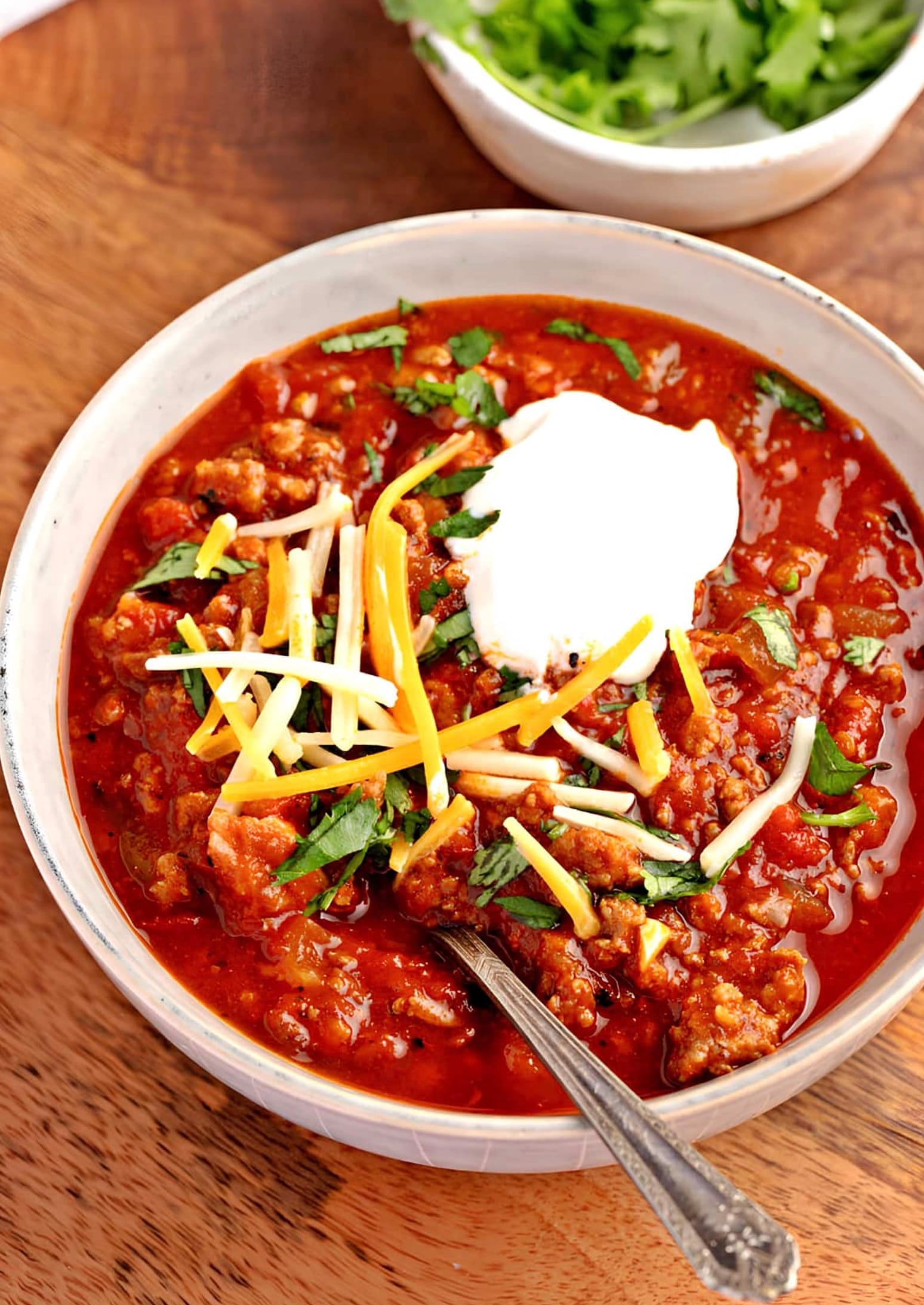 Don’t forget to grab some toppings for your chili! Shredded cheese, sour cream, and chopped green onions are great choices. You can also add some crushed tortilla chips for extra crunch.