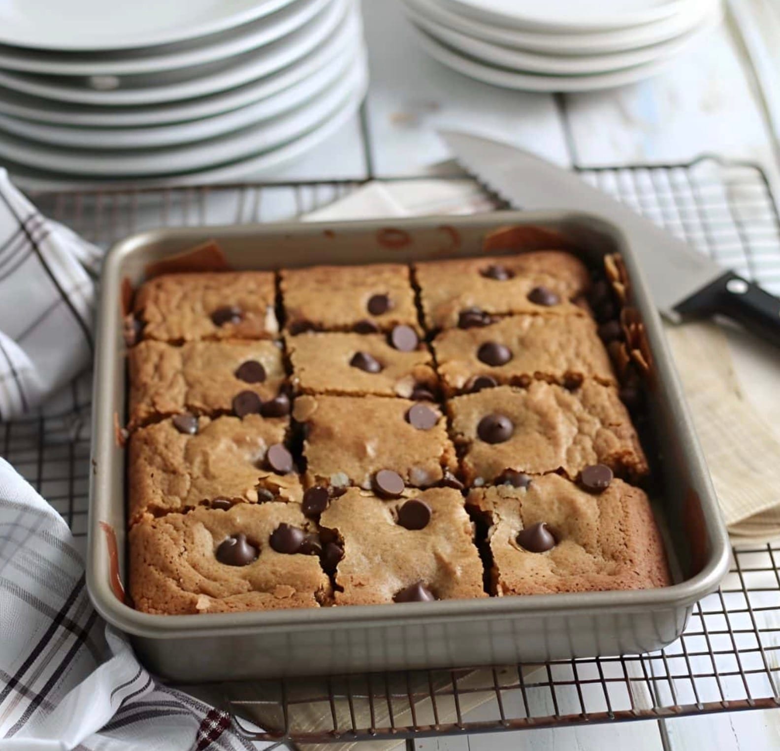Use a plastic knife to cut your blondies. It won’t stick to the chocolate chips like a metal knife would.