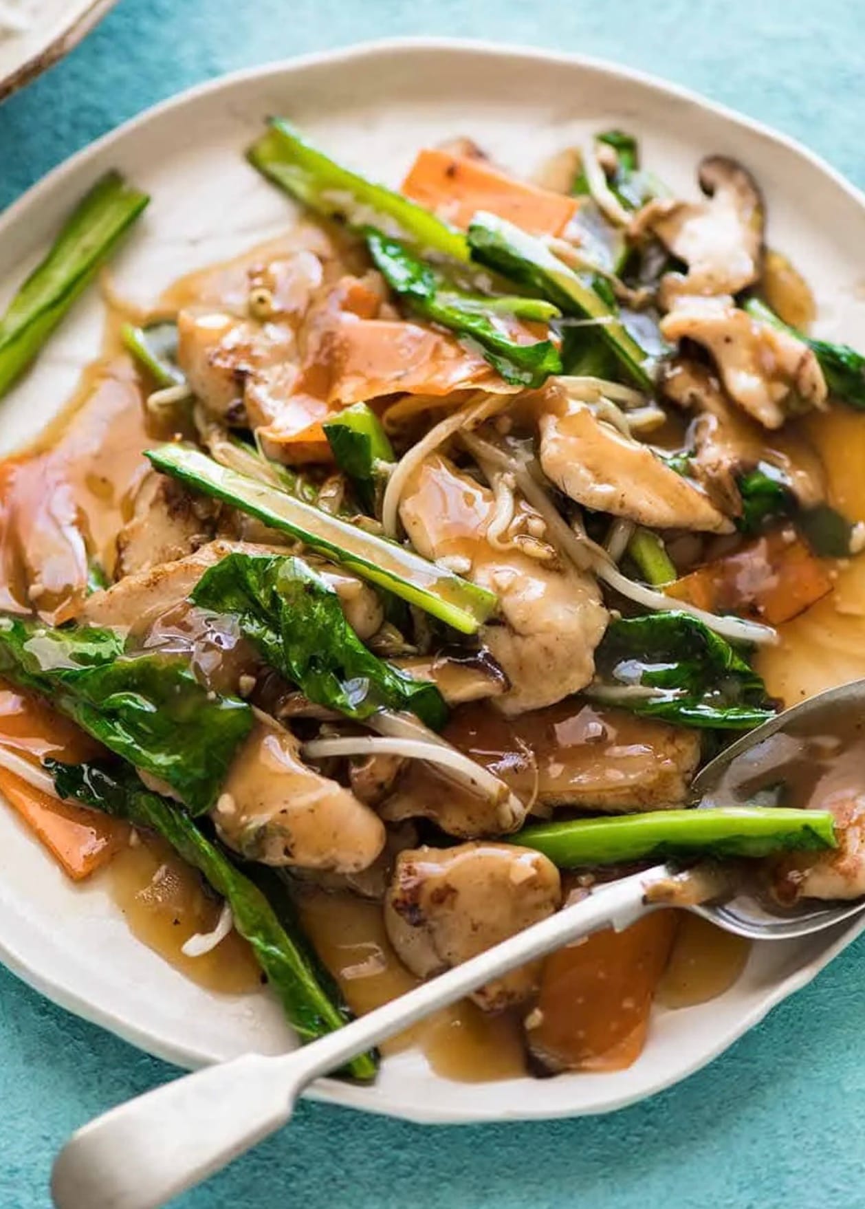 The key to great chop suey is the sauce. Chinese cooking wine gives it an authentic flavor. The dish is very flexible – you can use whatever veggies you have on hand. This recipe calls for choy sum, carrots, mushrooms, and bean sprouts, but feel free to mix it up.