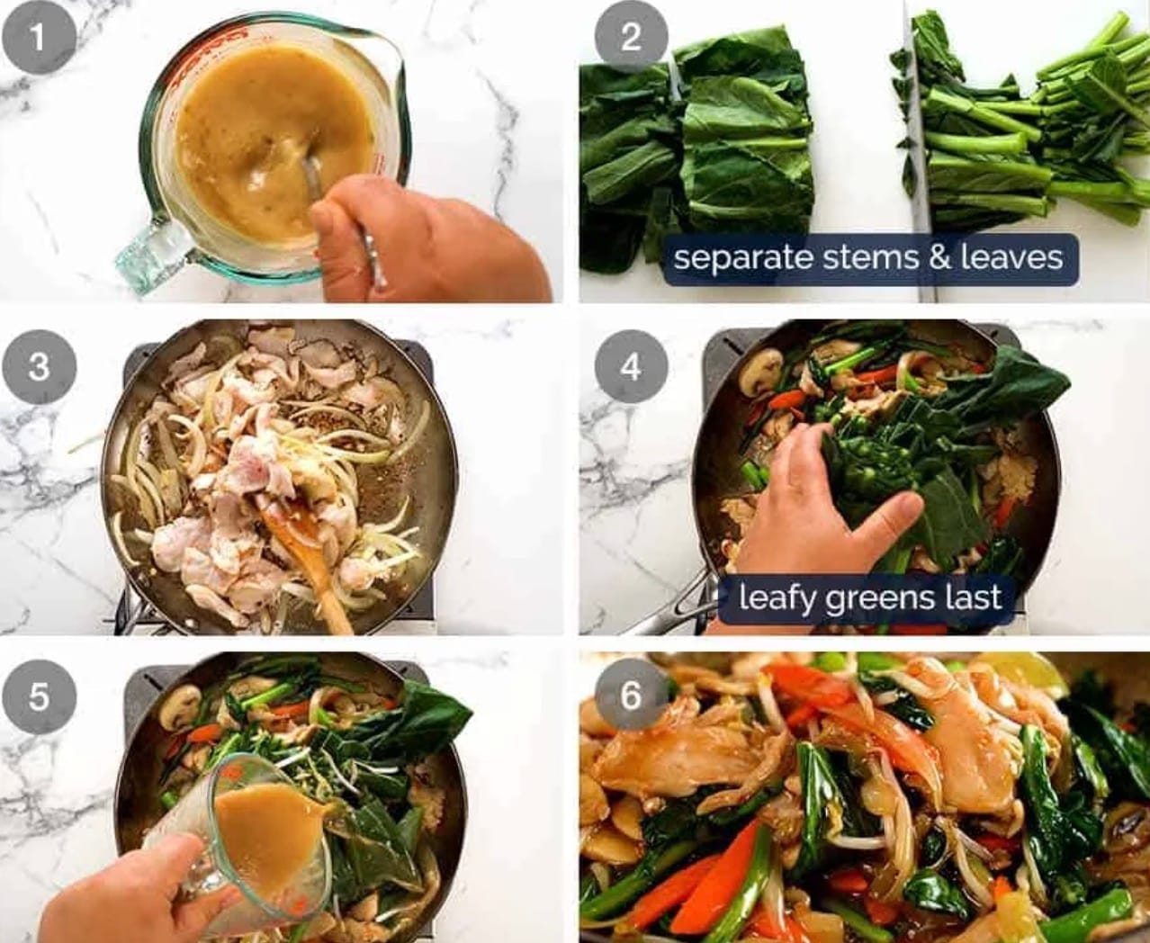 Add the chicken and cook for 1 minute until it turns white on the outside. Next, add choy sum stems, thinly sliced carrots, and mushrooms. Stir fry for another minute.