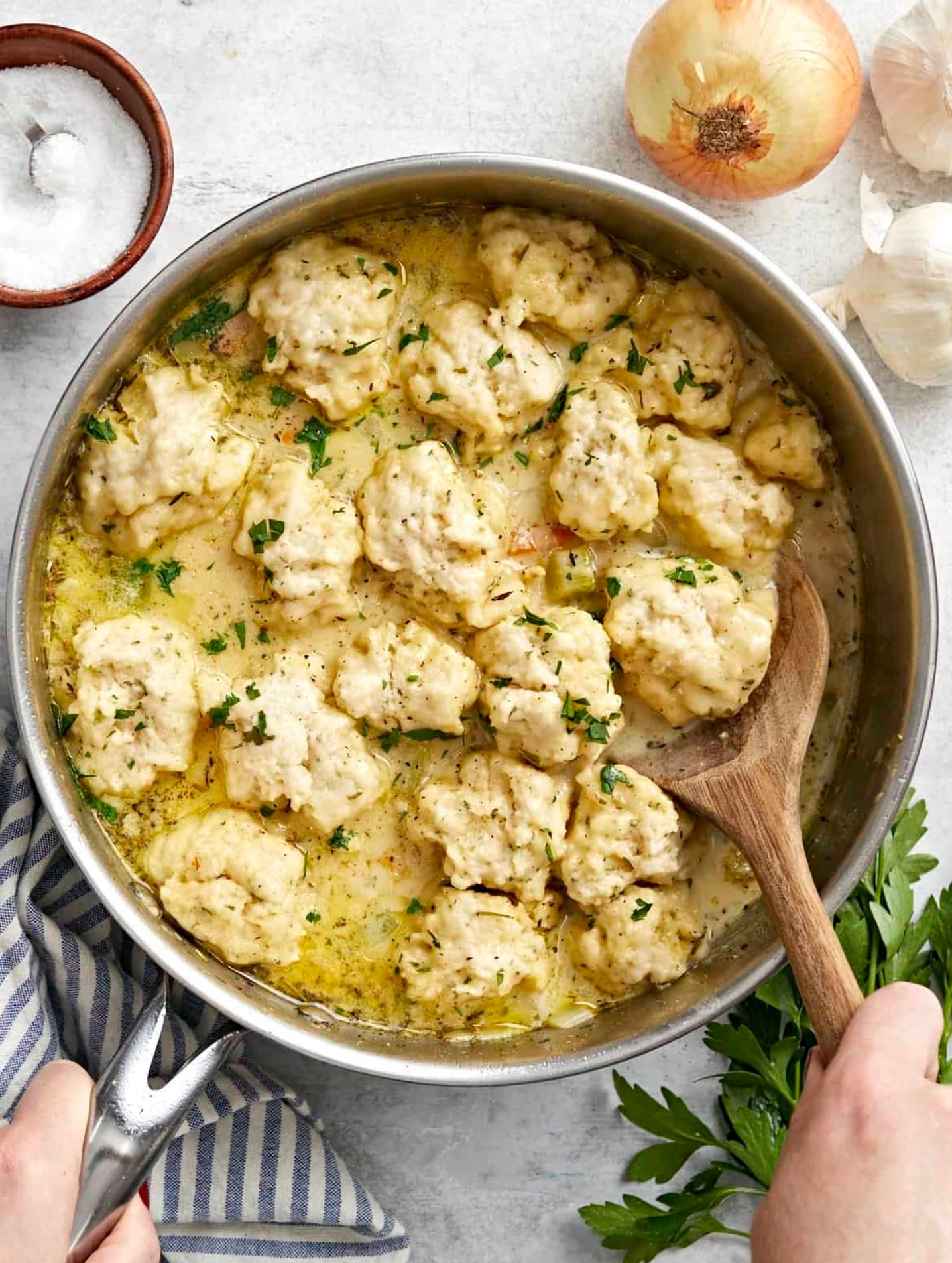 Cover and simmer for 15 minutes until dumplings are fluffy and cooked through. Serve your chicken and dumplings hot!