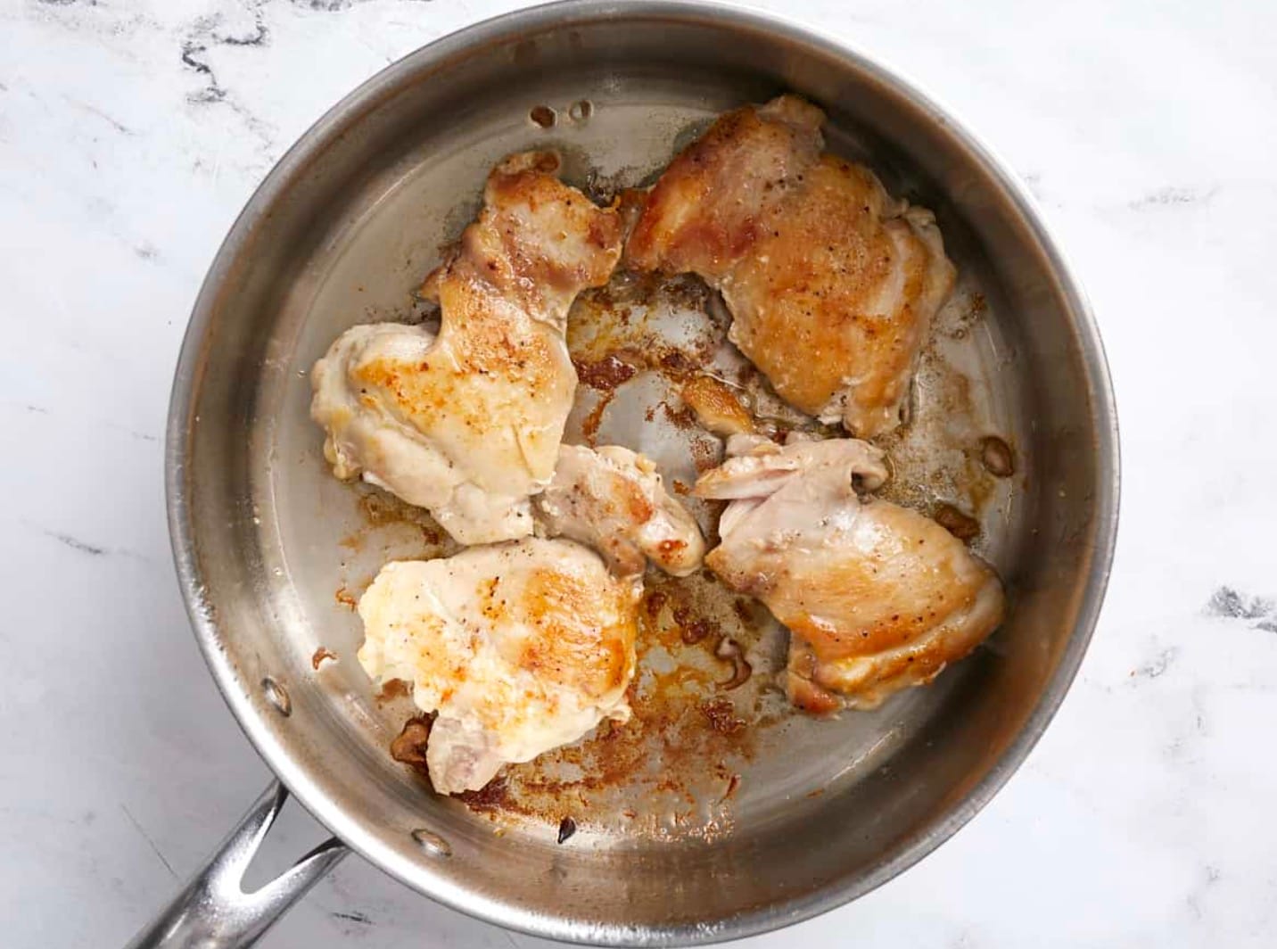 Heat olive oil in a deep skillet over medium heat. Add chicken thighs and brown them well on both sides. Remove the chicken to a bowl.
