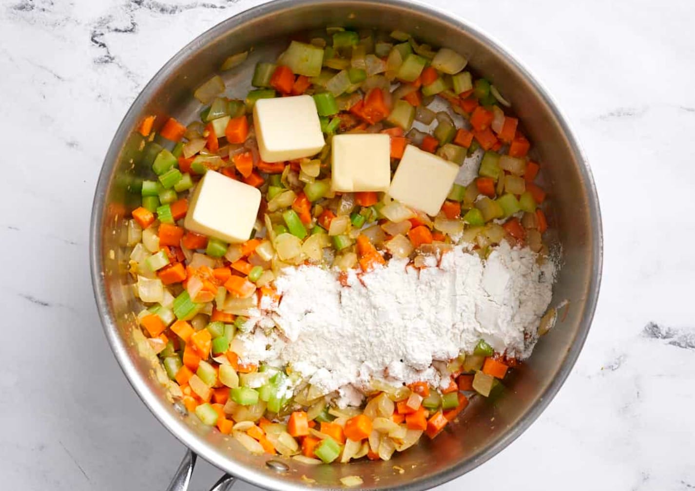 Melt butter in the skillet and stir in flour to coat the veggies. Cook this mixture for 2 minutes.