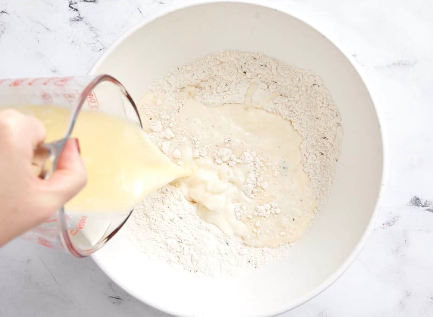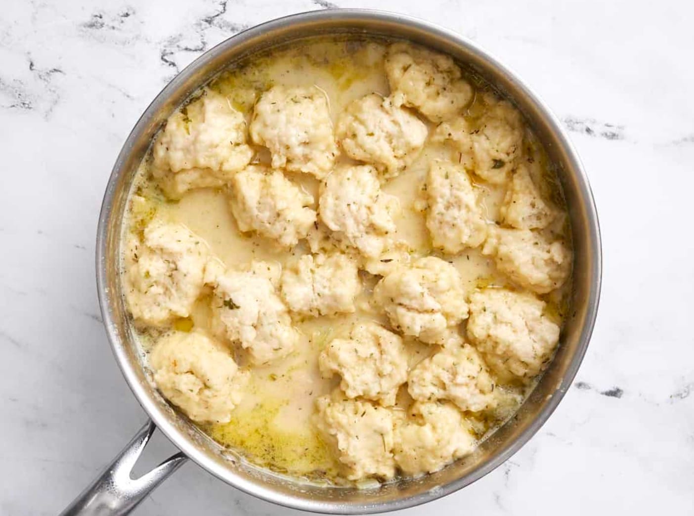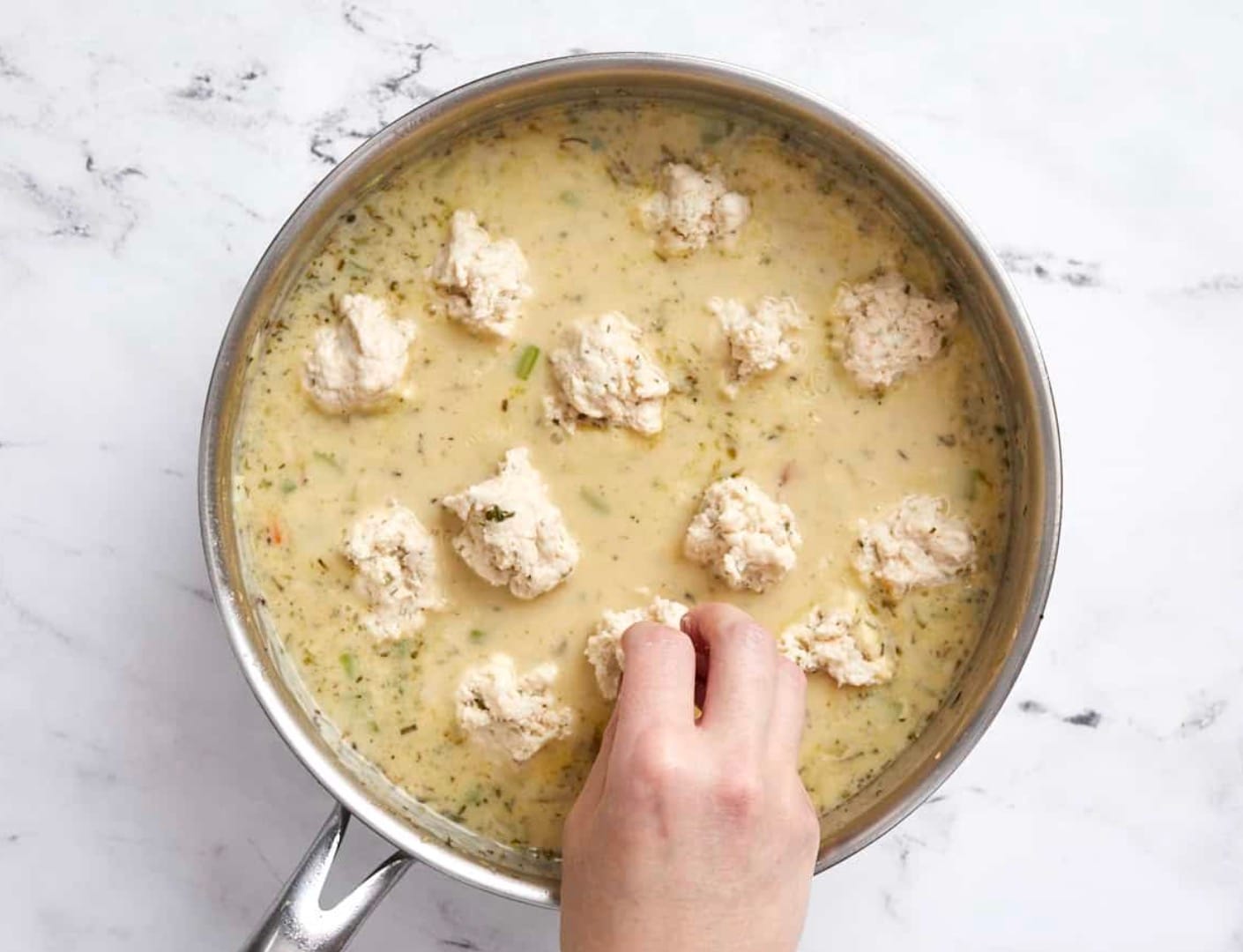 Mix dry dumpling ingredients in a bowl. Stir in milk and melted butter until just combined.