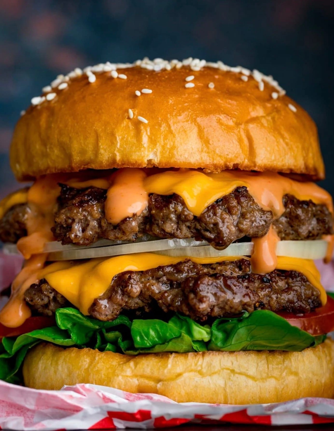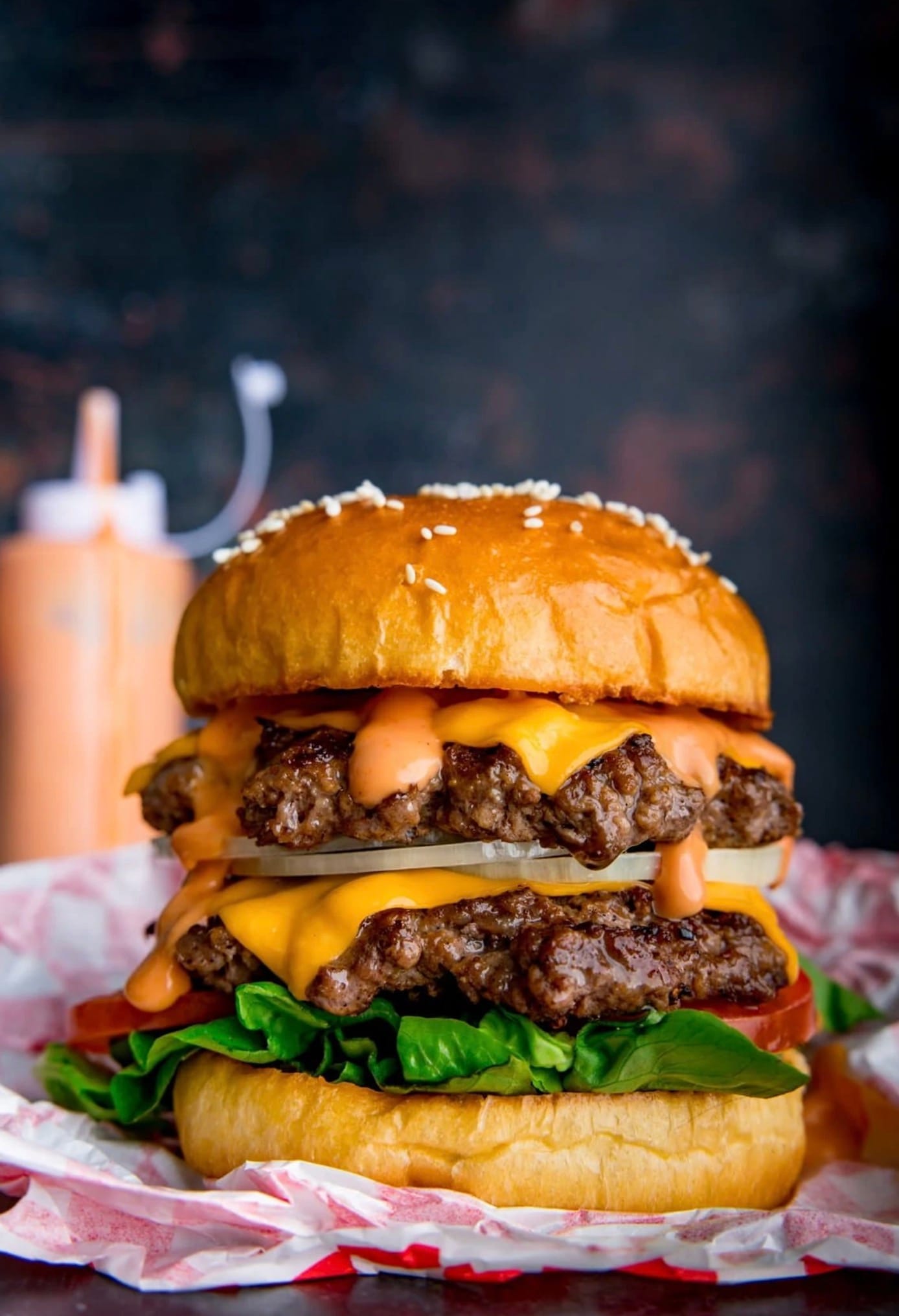 Drizzle your sauce over the top. Finish with the top bun and serve your double cheeseburgers right away.