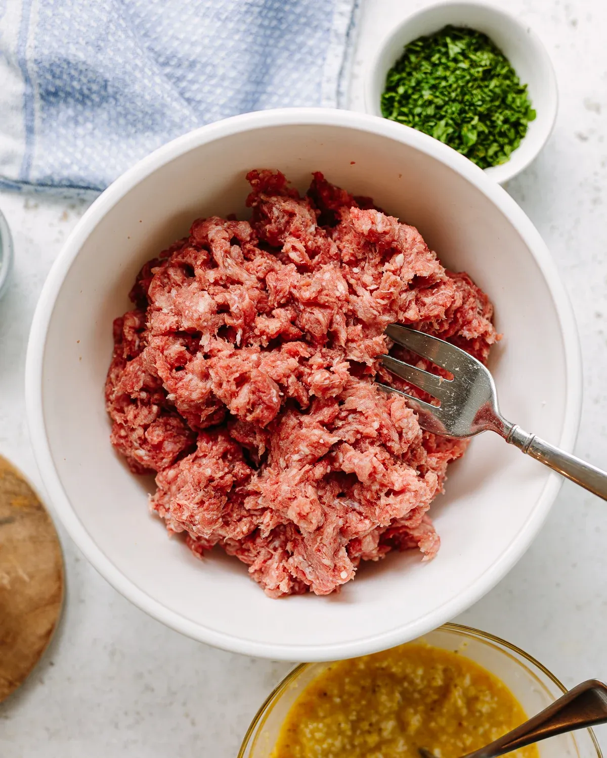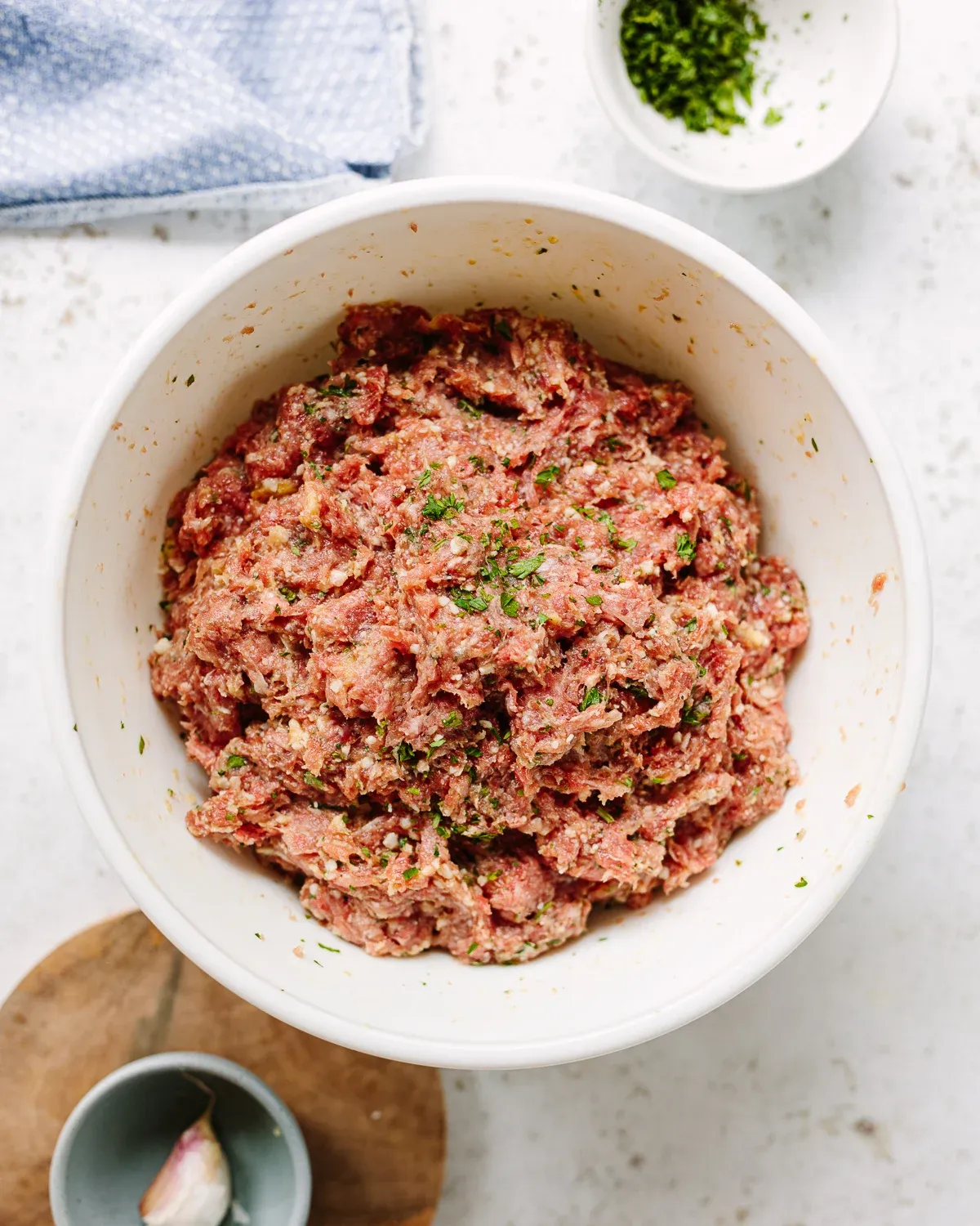 In a big bowl, mix the beef, pork, and onion (if you’re using it). Add the bread mixture and parsley. Blend it all together with your hands or a big spoon.