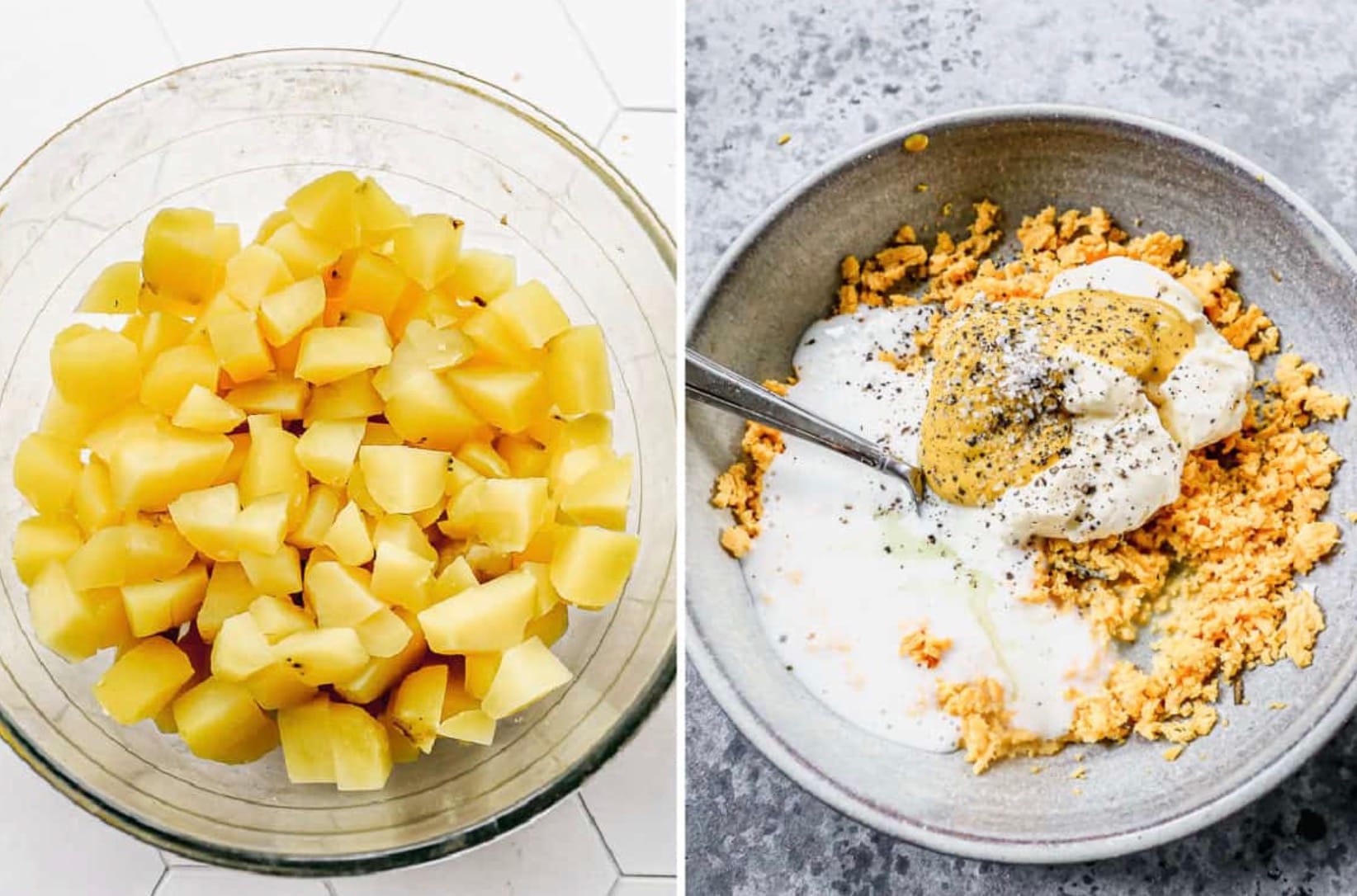 Add a splash of vinegar to the warm potatoes for extra tang. You can use apple cider vinegar or white vinegar. This step really boosts the flavor.
