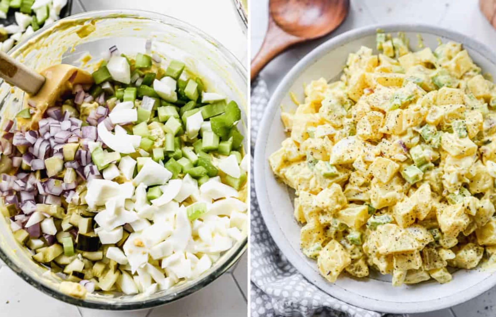 To save time, make the dressing while the potatoes are cooking. You can also prep the celery and onions ahead of time.