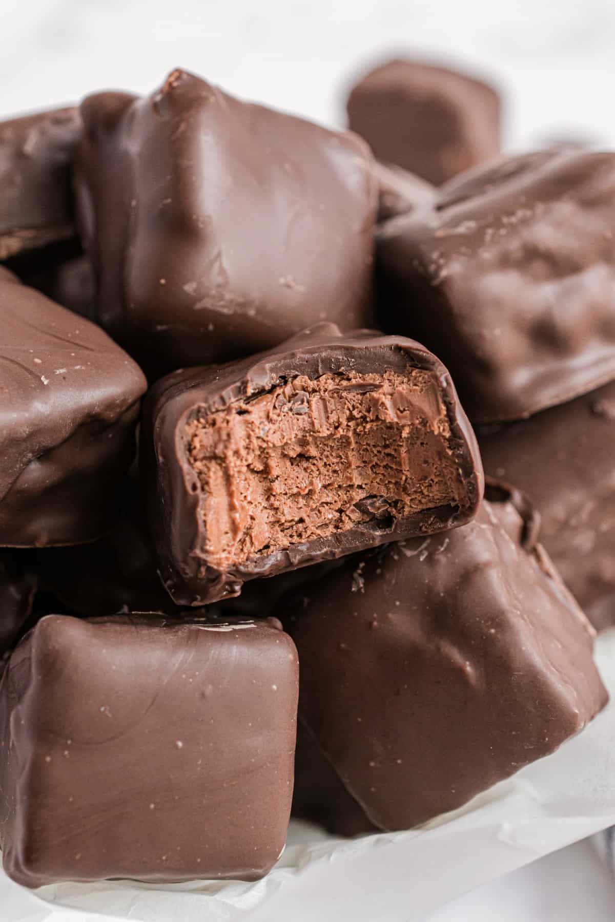For the final touch, dip the squares in melted dark chocolate. Put them back in the freezer to complete. This keeps the candy tasty and fun to eat.