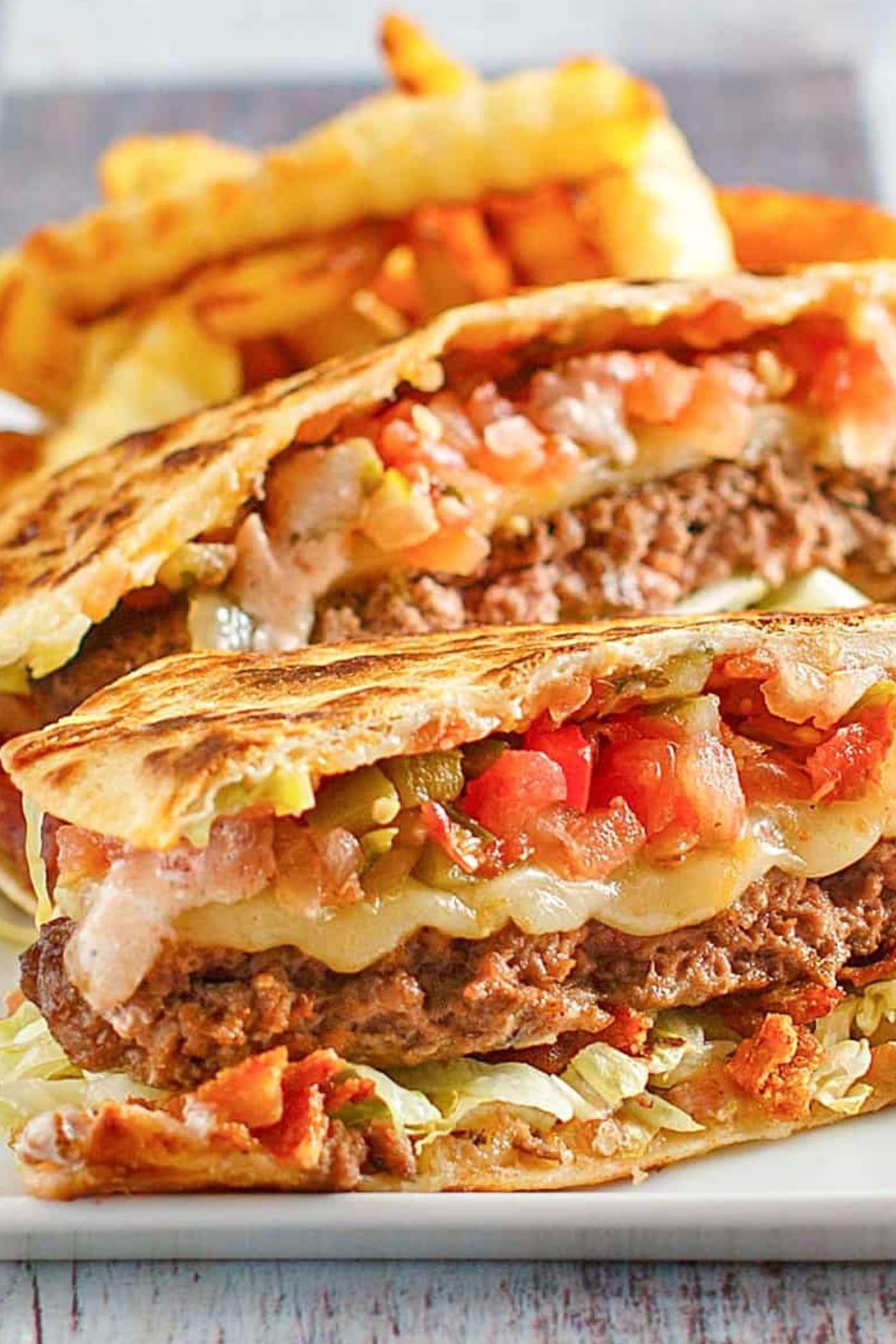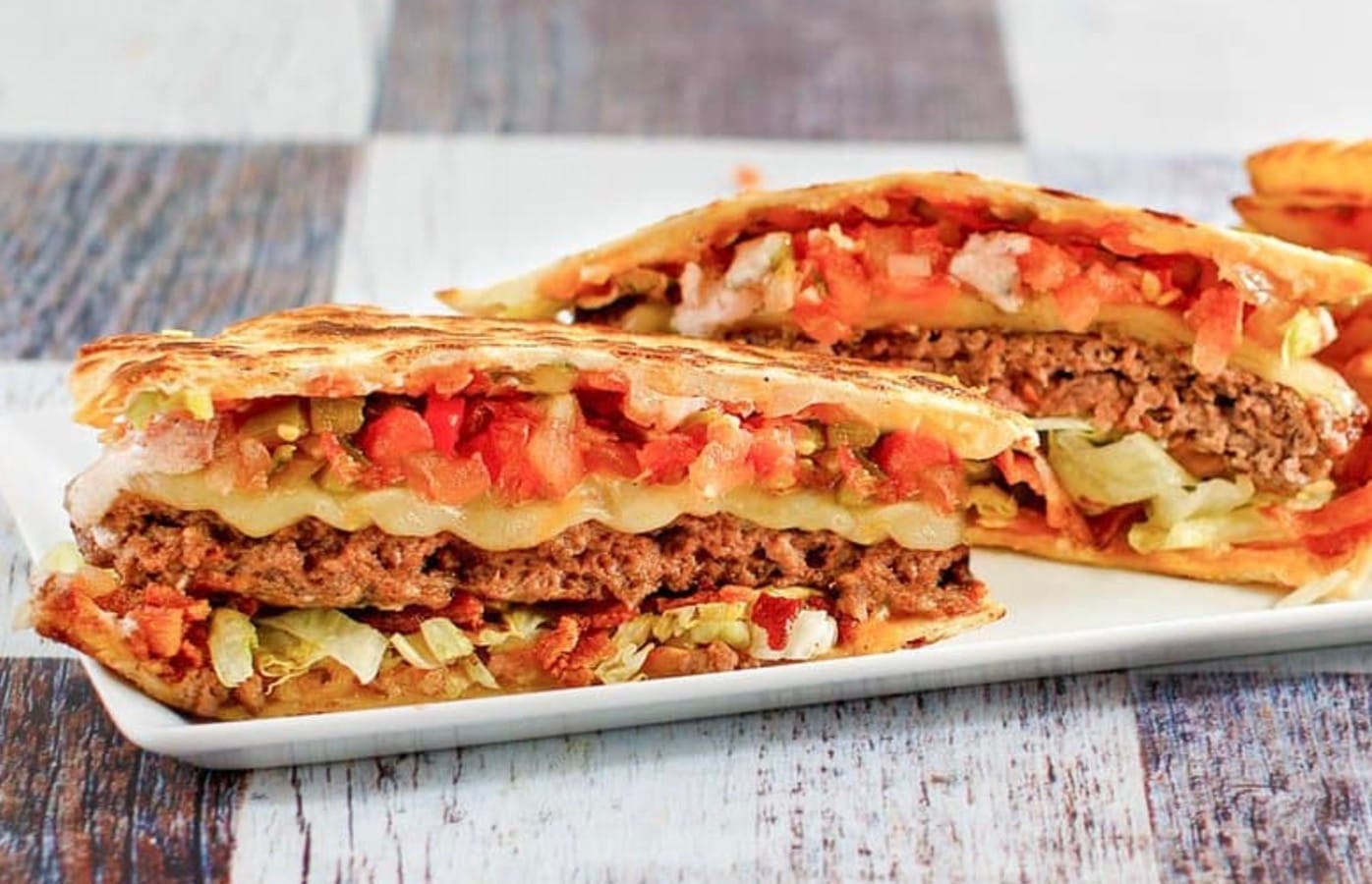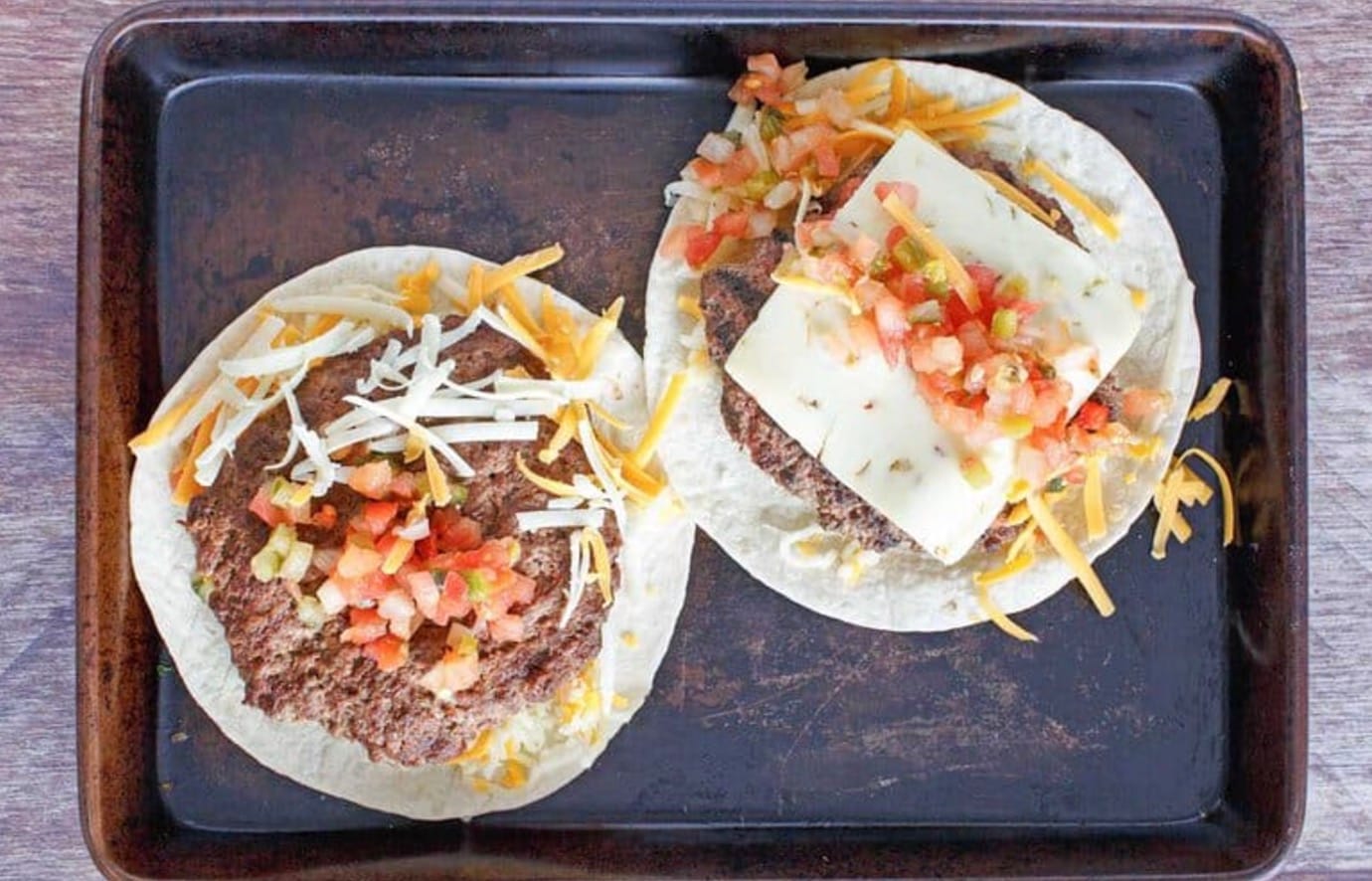 - Cover the burger with another quesadilla.