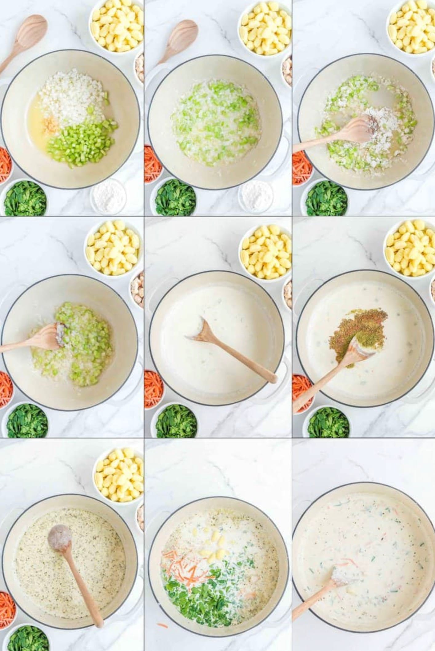 Add shredded carrots, chopped spinach, diced chicken, and gnocchi to the pot. Give it all a good stir.