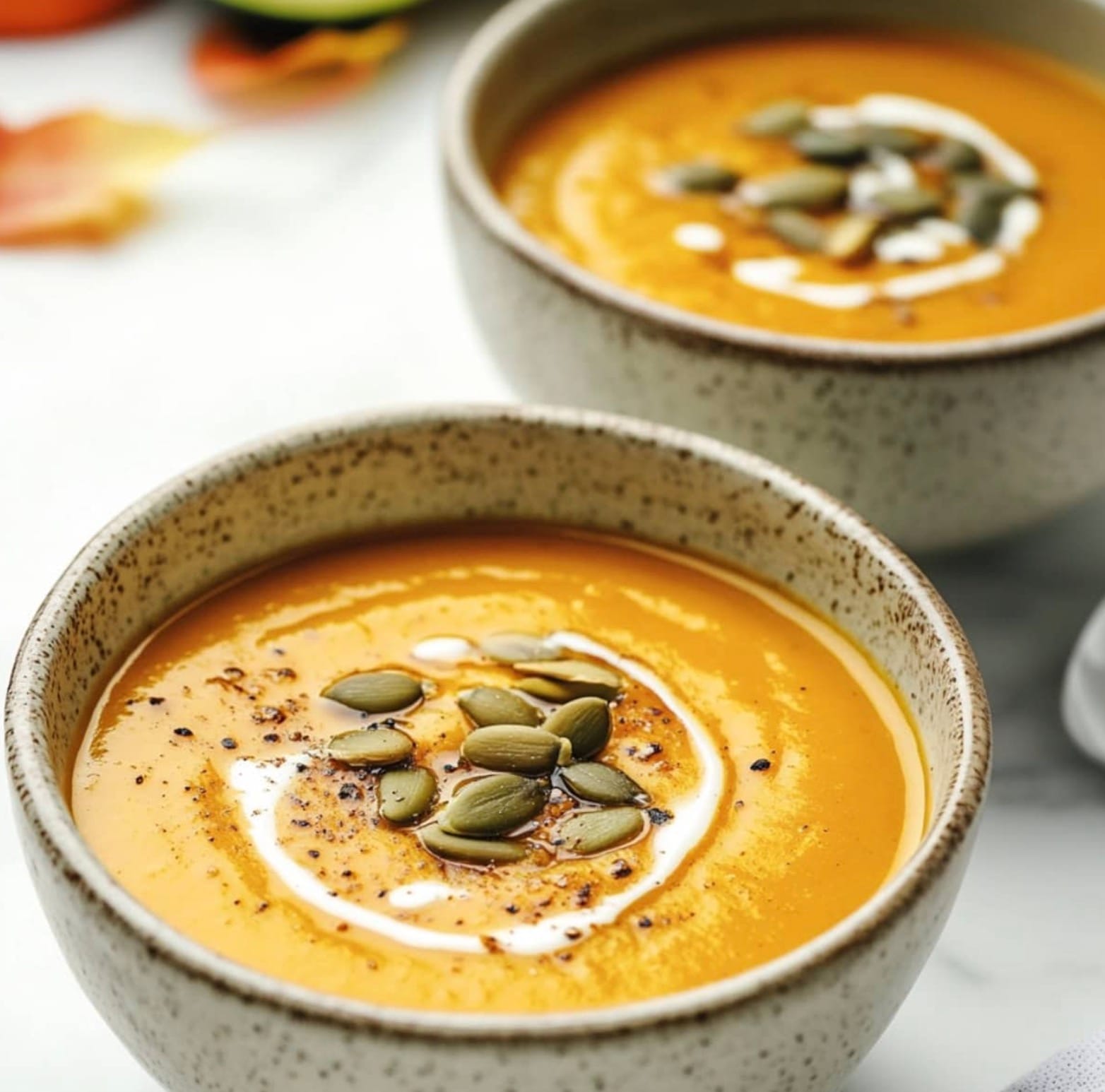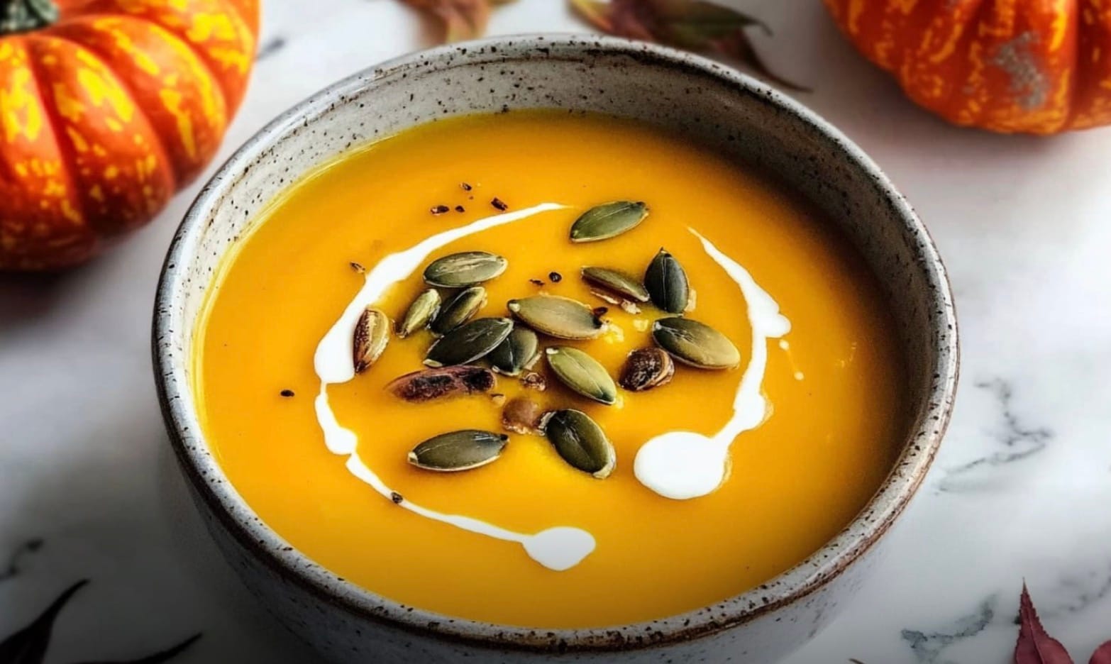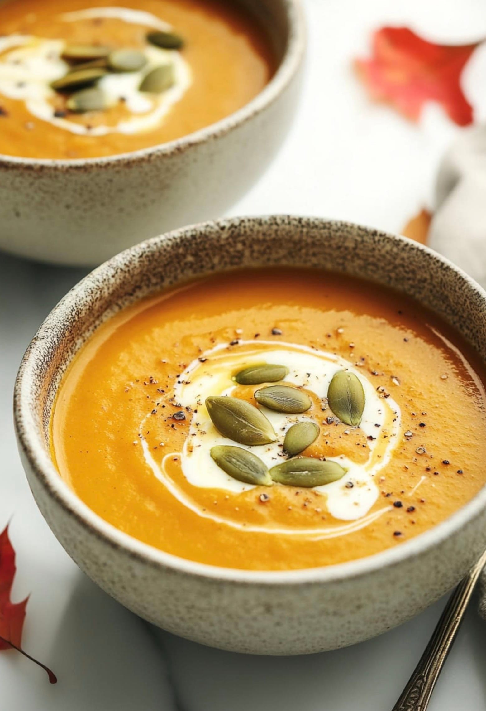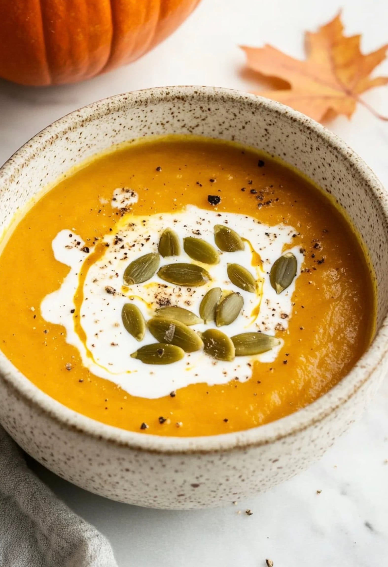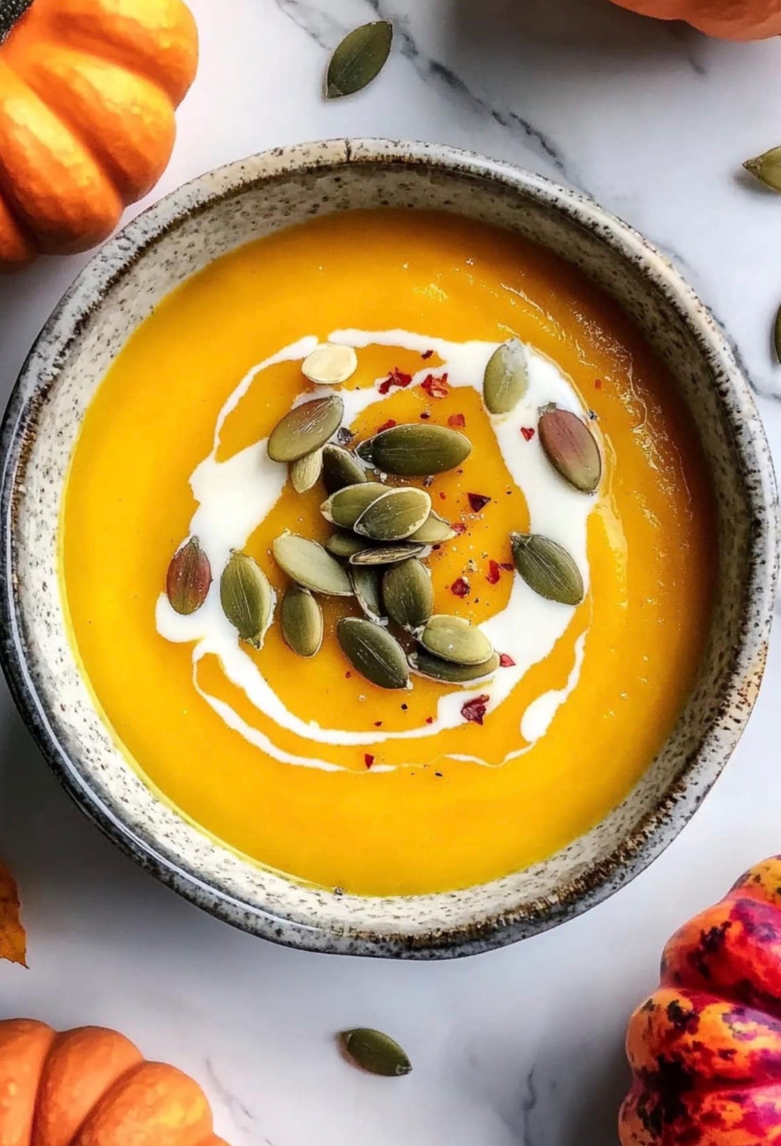 Serve your soup hot in bowls. Top with a swirl of cream and some pumpkin seeds for crunch. Enjoy your cozy autumn meal!