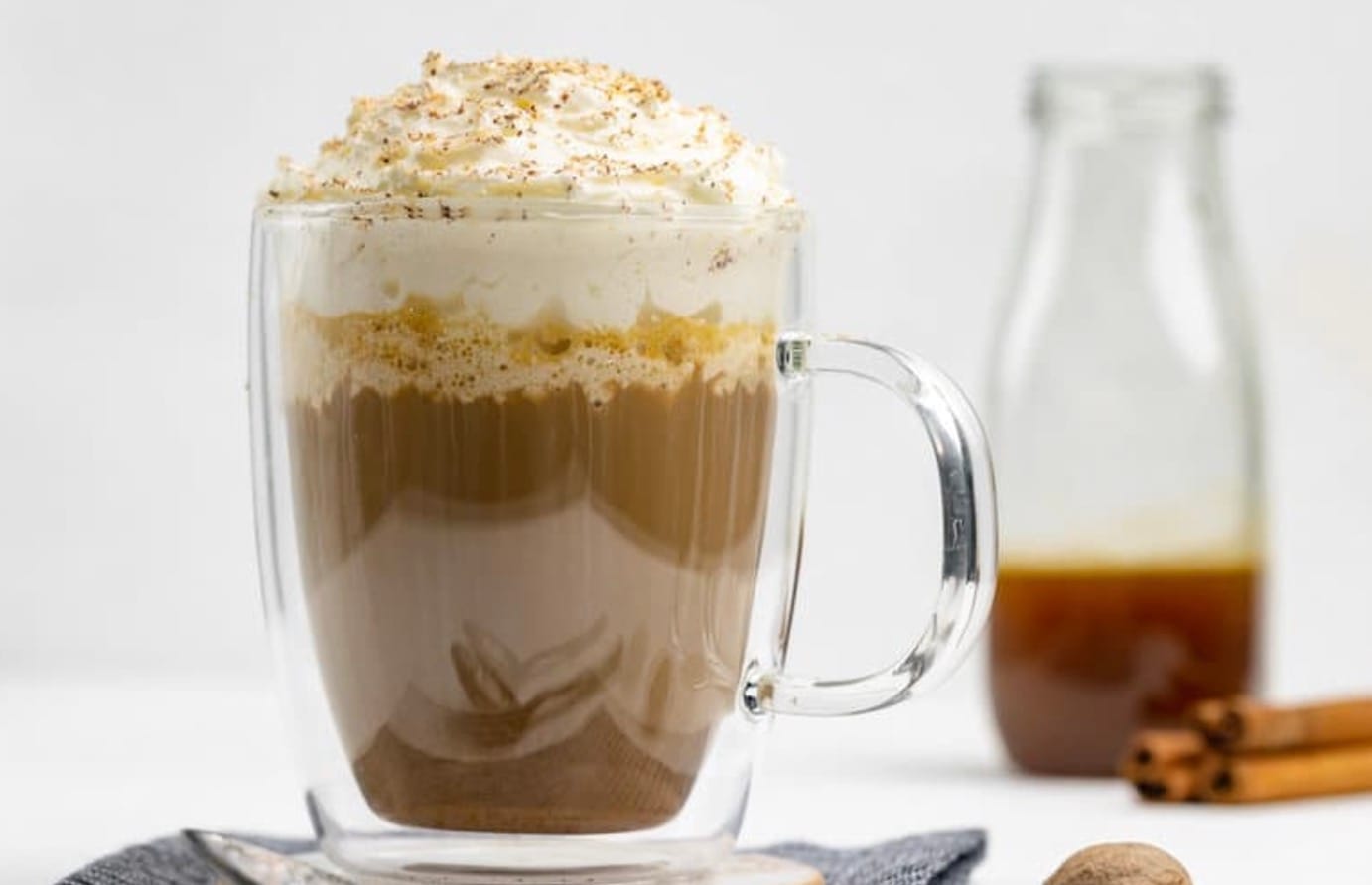 These simple ingredients come together to make a tasty drink. You can adjust the amount of syrup to suit your taste. The whipped cream and nutmeg on top give it that special Starbucks touch.