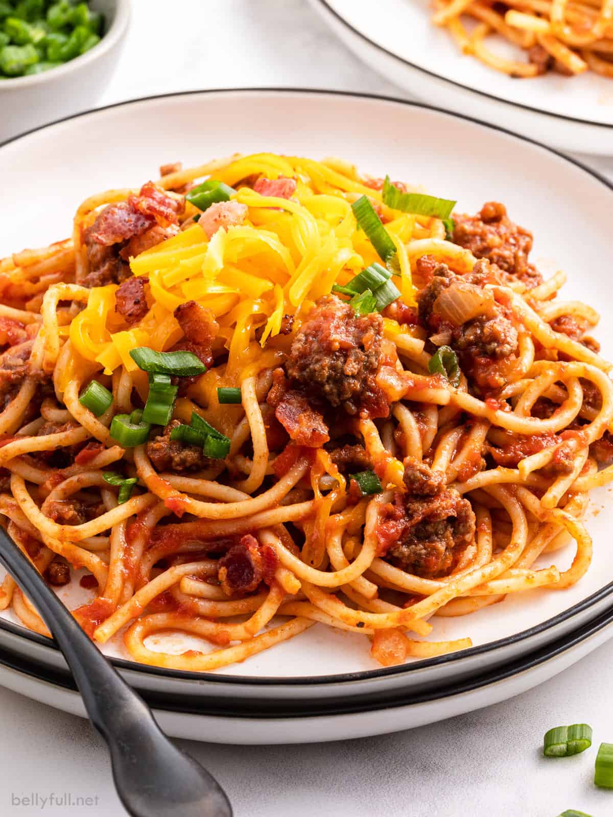 Top your spaghetti with cheddar, scallions, and the bacon you cooked earlier. It will be crunchy and tasty. This is how you make Cowboy Spaghetti. Enjoy!