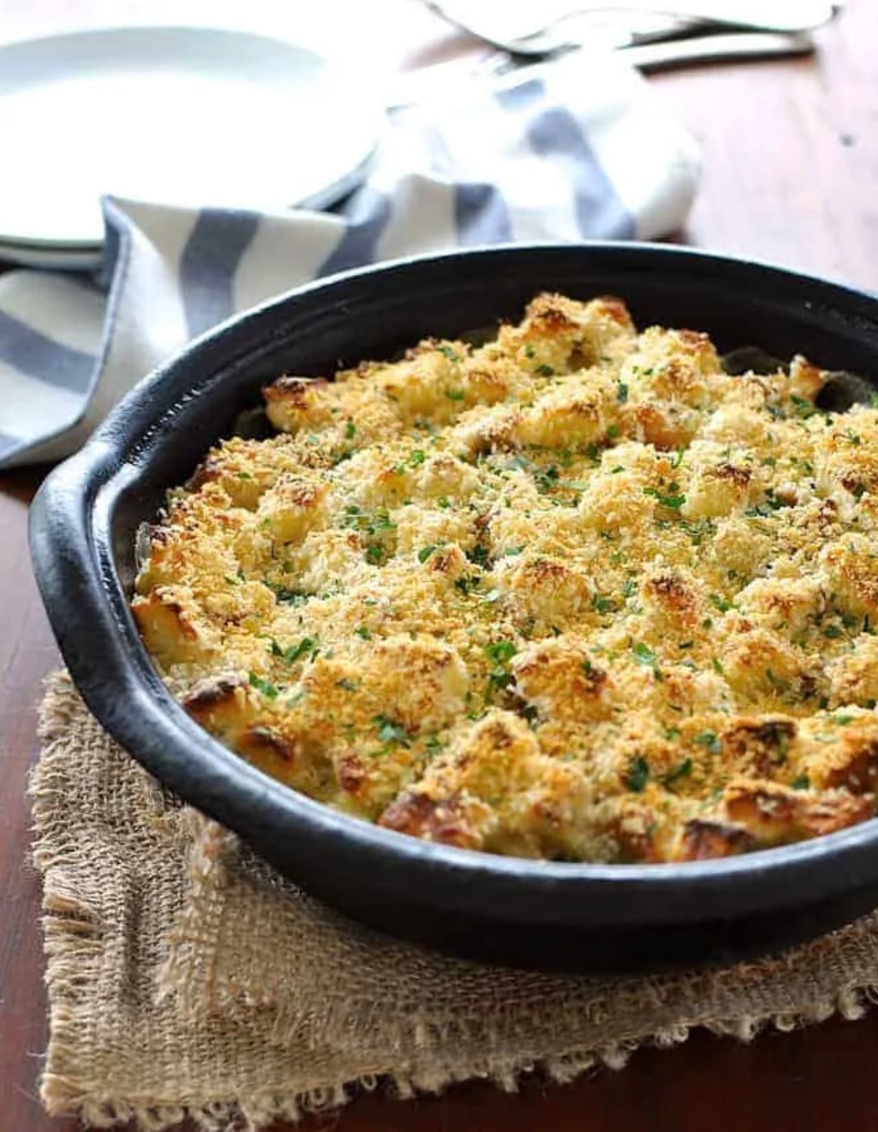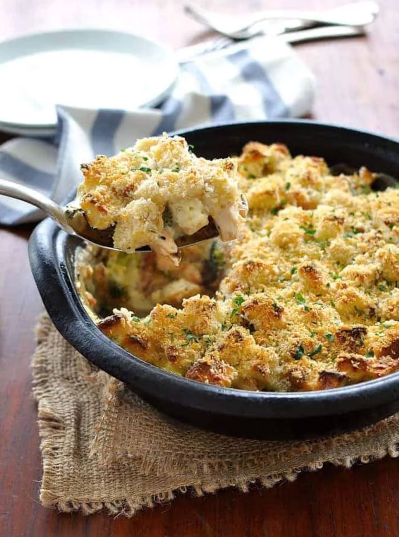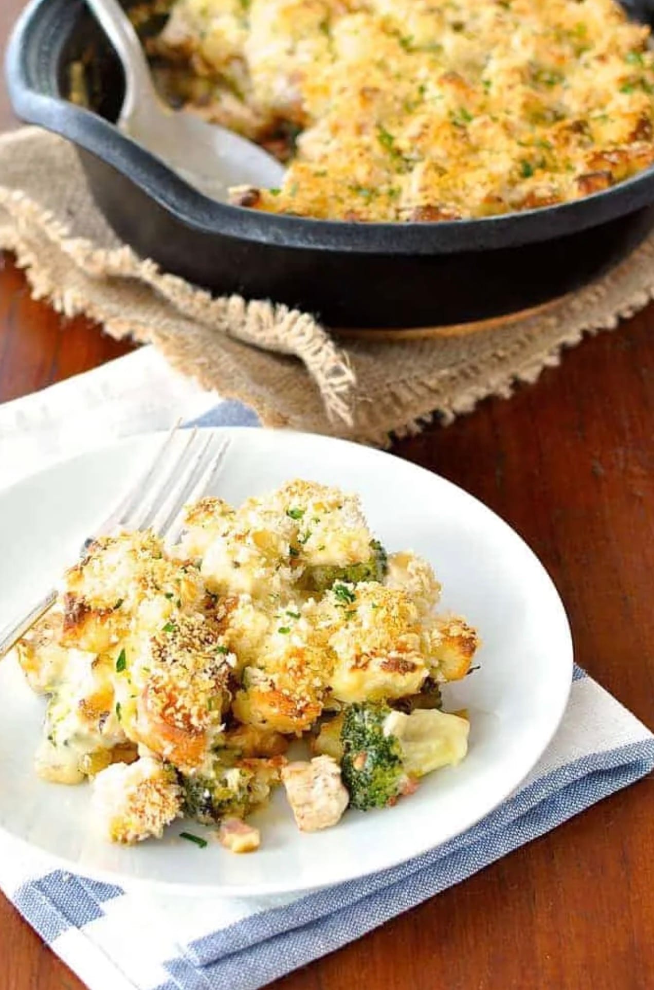 This dish is like a savory bread pudding. It’s got crispy bacon, tender chicken, and fresh broccoli all mixed in a creamy sauce. The best part? It’s topped with crunchy bread and cheese that gets golden brown in the oven. It’s filling and delicious, but with fewer carbs than a pasta bake.