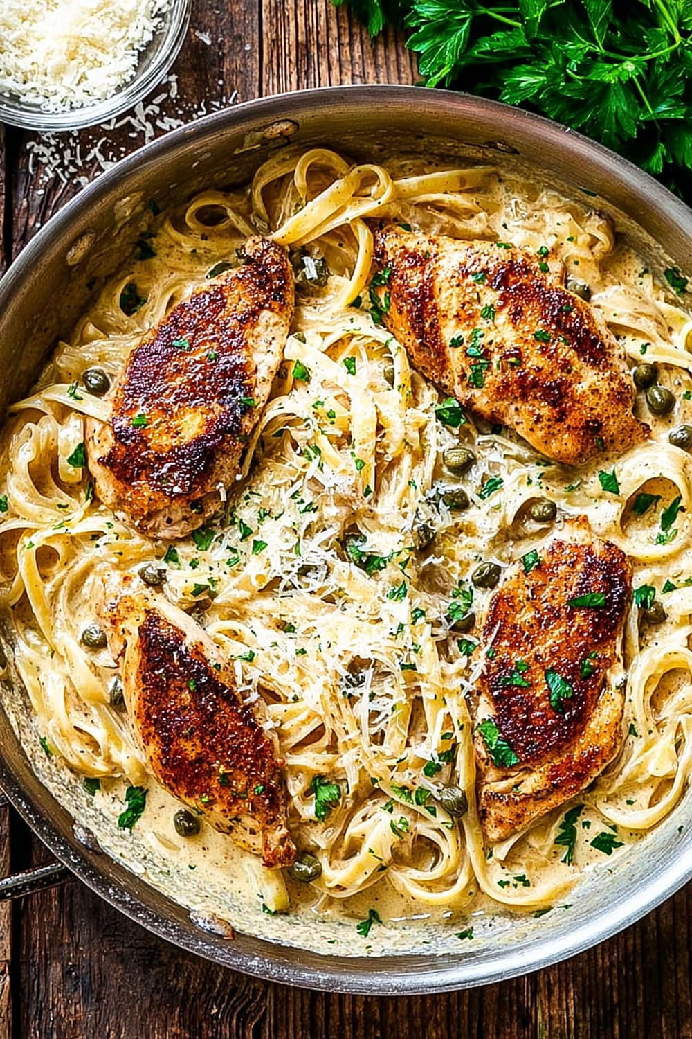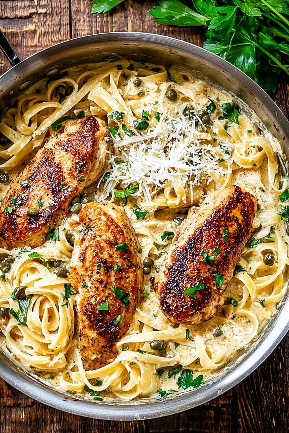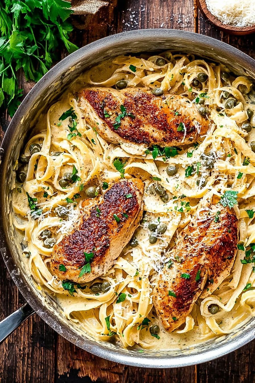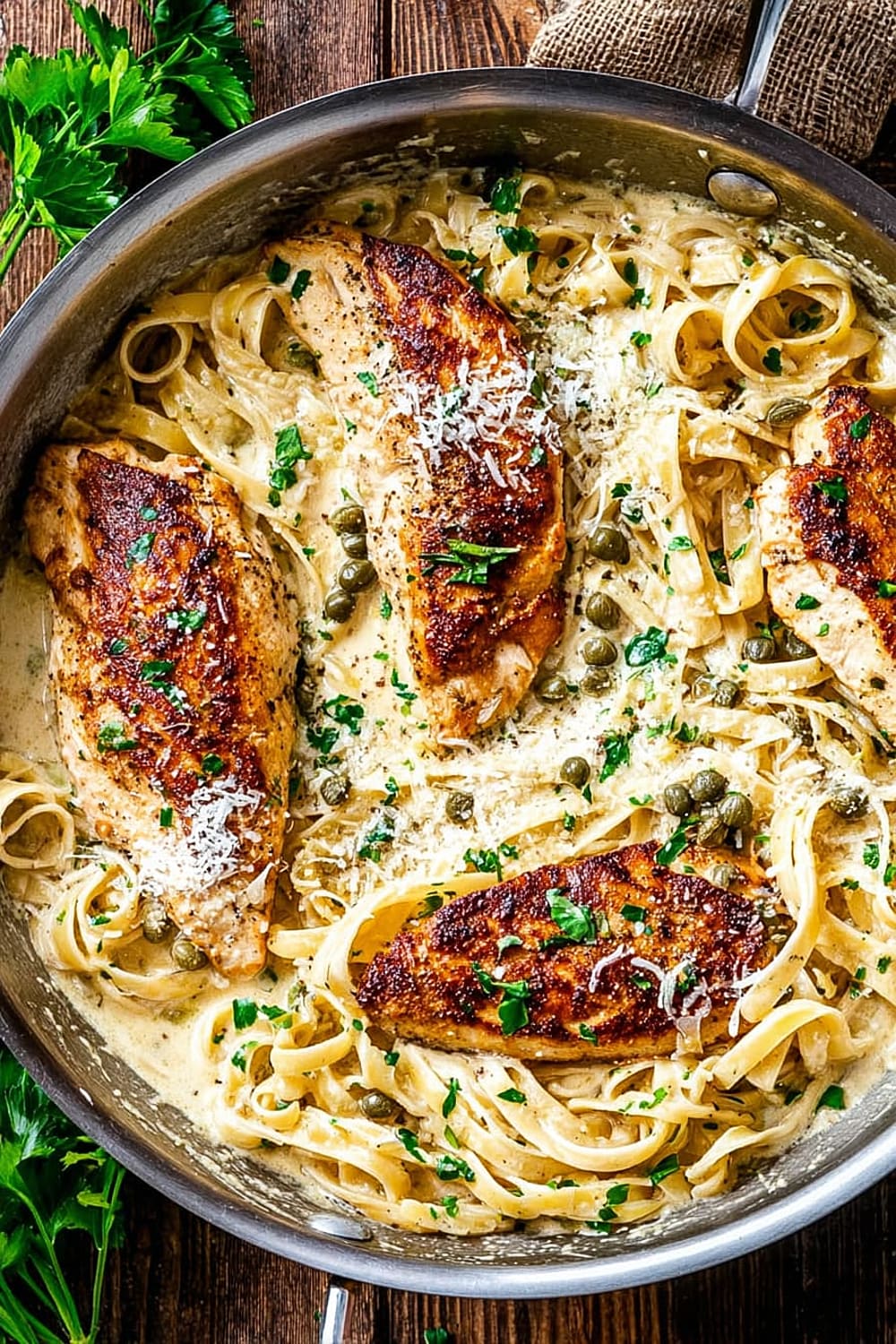 This recipe contains gluten (from flour and pasta), dairy (butter and cream), and is naturally nut-free. The sodium content is moderate thanks to the capers and chicken broth, so those watching sodium intake may want to use low-sodium broth and rinse the capers. One serving provides approximately 25-30% of daily protein needs for most adults, making it a satisfying main course that can help maintain stable blood sugar levels when paired with a side salad.