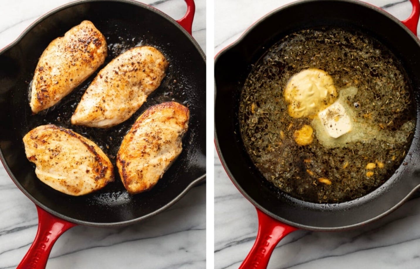 Remember to cut the chicken breasts in half to make 4 thinner pieces. This helps them cook faster and more evenly. You’ll use the butter in two parts – some for cooking the chicken and the rest for the sauce.