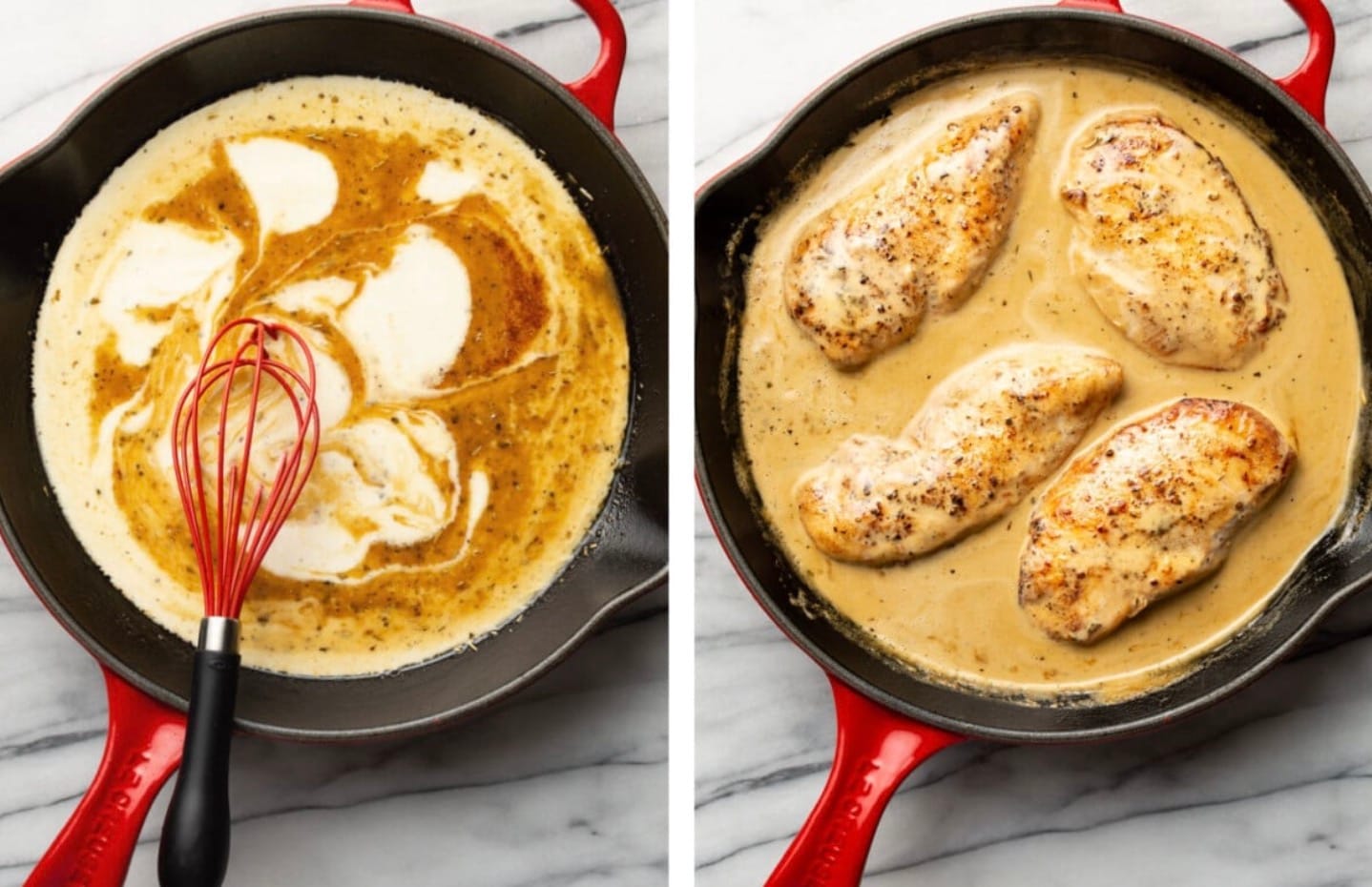 Pour in the cream and put the pan back on the stove. Once it’s bubbling, add the chicken back in. Turn down the heat and let it simmer for 5 minutes.