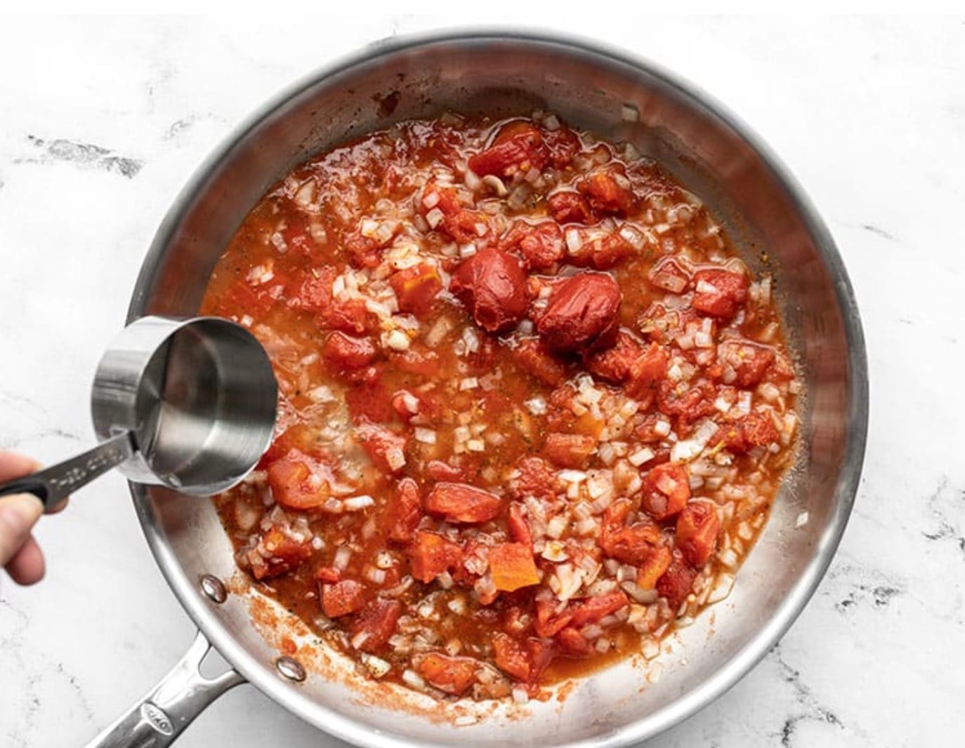 Pour in the diced tomatoes with their juice. Add oregano, basil, red pepper flakes, salt, and black pepper. Stir in tomato paste and 1/2 cup water until well mixed.
