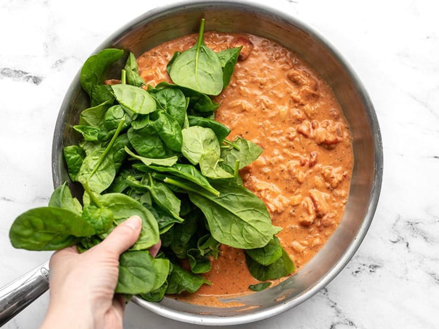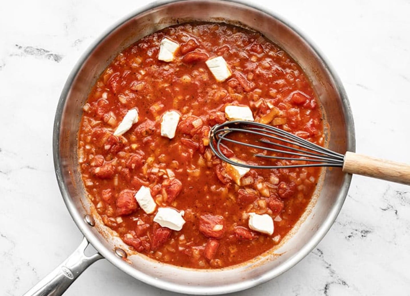 The sauce comes together easily in a skillet. You’ll sauté the onion and garlic, then add tomatoes and spices. The cream cheese and Parmesan make it rich and creamy. Last step is wilting the spinach right in the sauce.