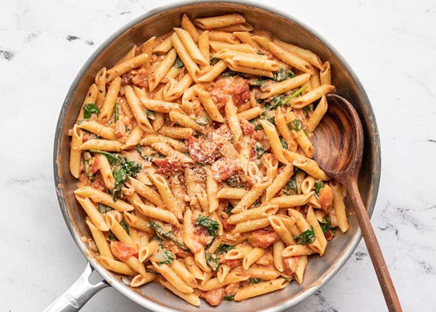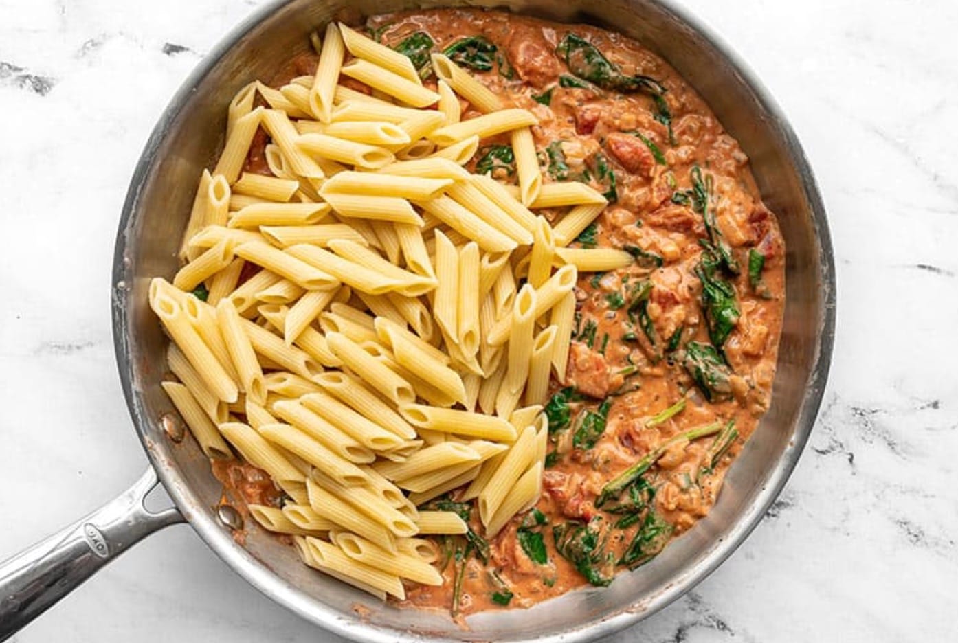 To make this creamy tomato and spinach pasta more diabetes-friendly, you can try a few simple swaps.